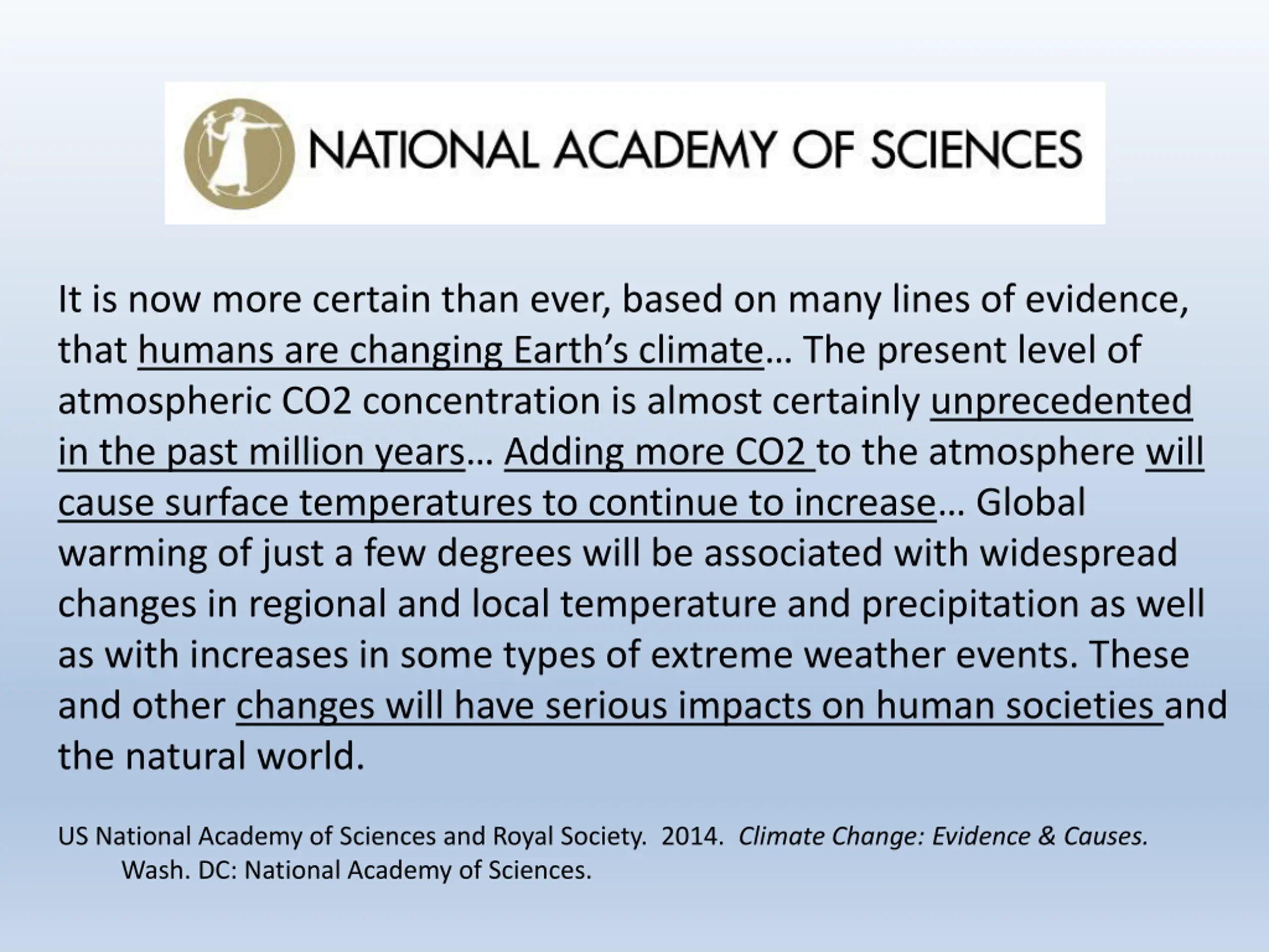 It is now more certain than ever, based on many lines of evidence, that humans are changing Earth s climate The present level of atmospheric CO2 concentration is almost certainly unprecedented in the past million years Adding more CO2 to the atmosphere will cause surface temperatures to continue to increase Global warming of just a few degrees will be associated with widespread changes in regional and local temperature and precipitation as well as with increases in some types of extreme weather events. These and other changes will have serious impacts on human societies and the natural world. US National Academy of Sciences and Royal Society. 2014. Climate Change: Evidence & Causes. Wash. DC: National Academy of Sciences.