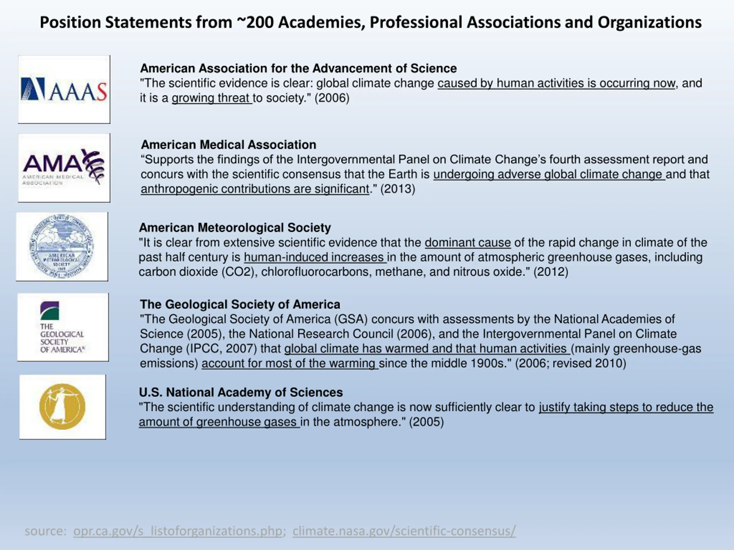 Position Statements from ~200 Academies, Professional Associations and Organizations American Association for the Advancement of Science "The scientific evidence is clear: global climate change caused by human activities is occurring now, and it is a growing threat to society." (2006) American Medical Association Supports the findings of the Intergovernmental Panel on ClimateChange s fourth assessment report and concurs with the scientific consensus that the Earth is undergoing adverse global climate change and that anthropogenic contributions are significant." (2013) American Meteorological Society "It is clear from extensive scientific evidence that the dominant cause of the rapid change in climate of the past half century is human-induced increases in the amount of atmospheric greenhouse gases, including carbon dioxide (CO2), chlorofluorocarbons, methane, and nitrous oxide." (2012) The Geological Society of America "The Geological Society of America (GSA) concurs with assessments by the National Academies of Science (2005), the National Research Council (2006), and the Intergovernmental Panel on Climate Change (IPCC, 2007) that global climate has warmed and that human activities (mainly greenhouse gas emissions) account for most of the warming since the middle 1900s." (2006; revised 2010) U.S. National Academy of Sciences "The scientific understanding of climate change is now sufficiently clear to justify taking steps to reduce the amount of greenhouse gases in the atmosphere." (2005) source: opr.ca.gov/s_listoforganizations.php; climate.nasa.gov/scientific-consensus/