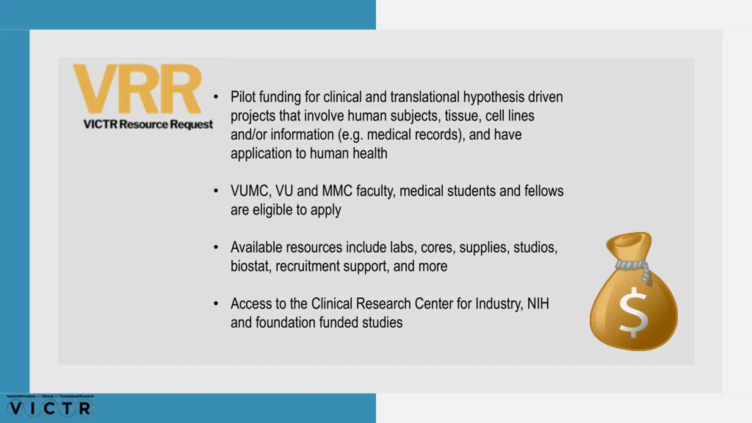 Pilot funding for clinical and translational hypothesis driven projects that involve human subjects, tissue, cell lines and/or information (e.g. medical records), and have application to human health VUMC, VU and MMC faculty, medical students and fellows are eligible to apply Available resources include labs, cores, supplies, studios, biostat, recruitment support, and more Access to the Clinical Research Center for Industry, NIH and foundation funded studies