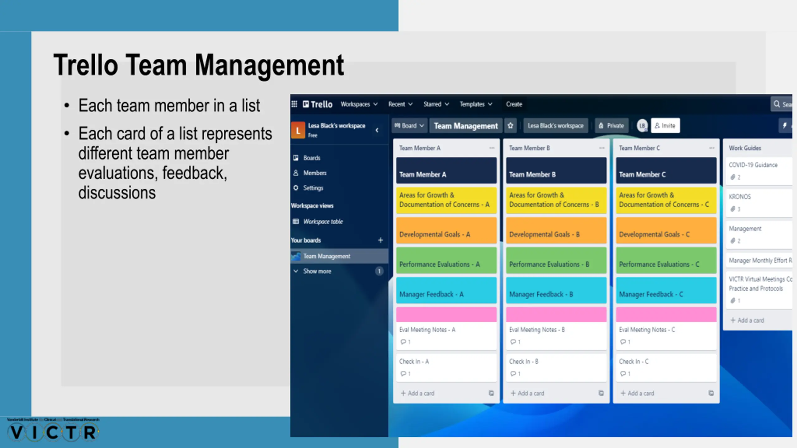 Trello Team Management Each team member in a list Each card of a list represents different team member evaluations, feedback, discussions