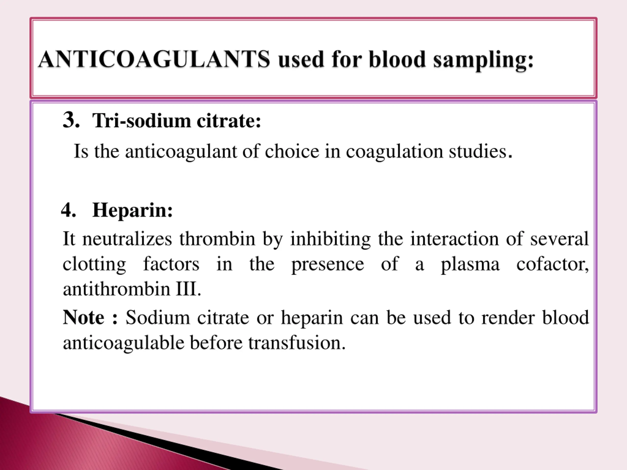 3. Tri-sodium citrate: Is the anticoagulant of choice in coagulation studies. 4. Heparin: It neutralizes thrombin by inhibiting the interaction of several clotting factors in the presence of a plasma cofactor, antithrombin III. Note : Sodium citrate or heparin can be used to render blood anticoagulable before transfusion.