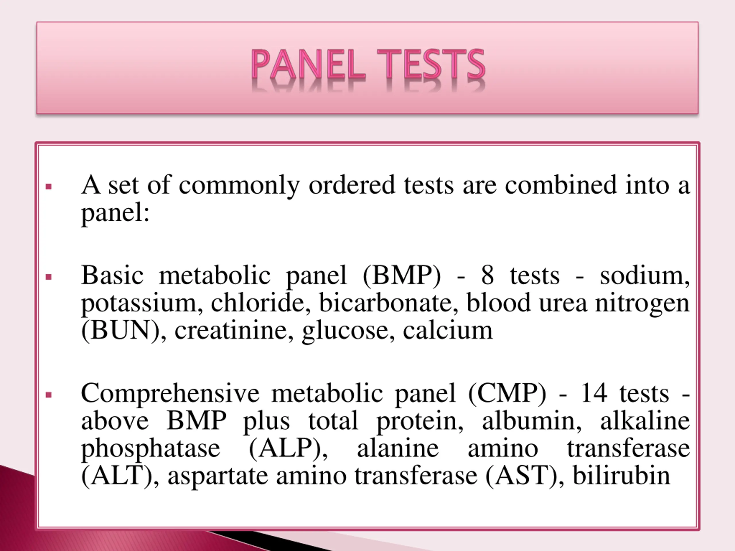 A set of commonly ordered tests are combined into a panel: Basic metabolic panel (BMP) - 8 tests - sodium, potassium, chloride, bicarbonate, blood urea nitrogen (BUN), creatinine, glucose, calcium Comprehensive metabolic panel (CMP) - 14 tests - above BMP plus total protein, albumin, alkaline phosphatase (ALP), alanine amino transferase (ALT), aspartate amino transferase (AST), bilirubin