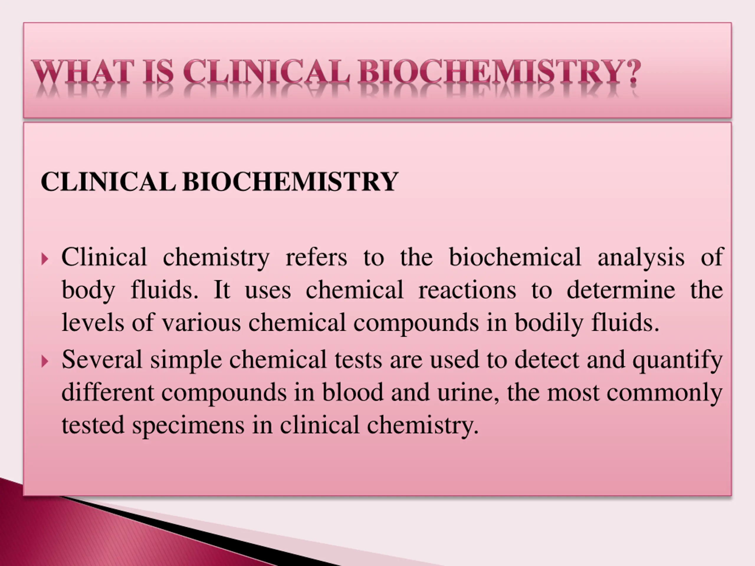 CLINICAL BIOCHEMISTRY Clinical chemistry refers to the biochemical analysis of body fluids. It uses chemical reactions to determine the levels of various chemical compounds in bodily fluids. Several simple chemical tests are used to detect and quantify different compounds in blood and urine, the most commonly tested specimens in clinical chemistry.