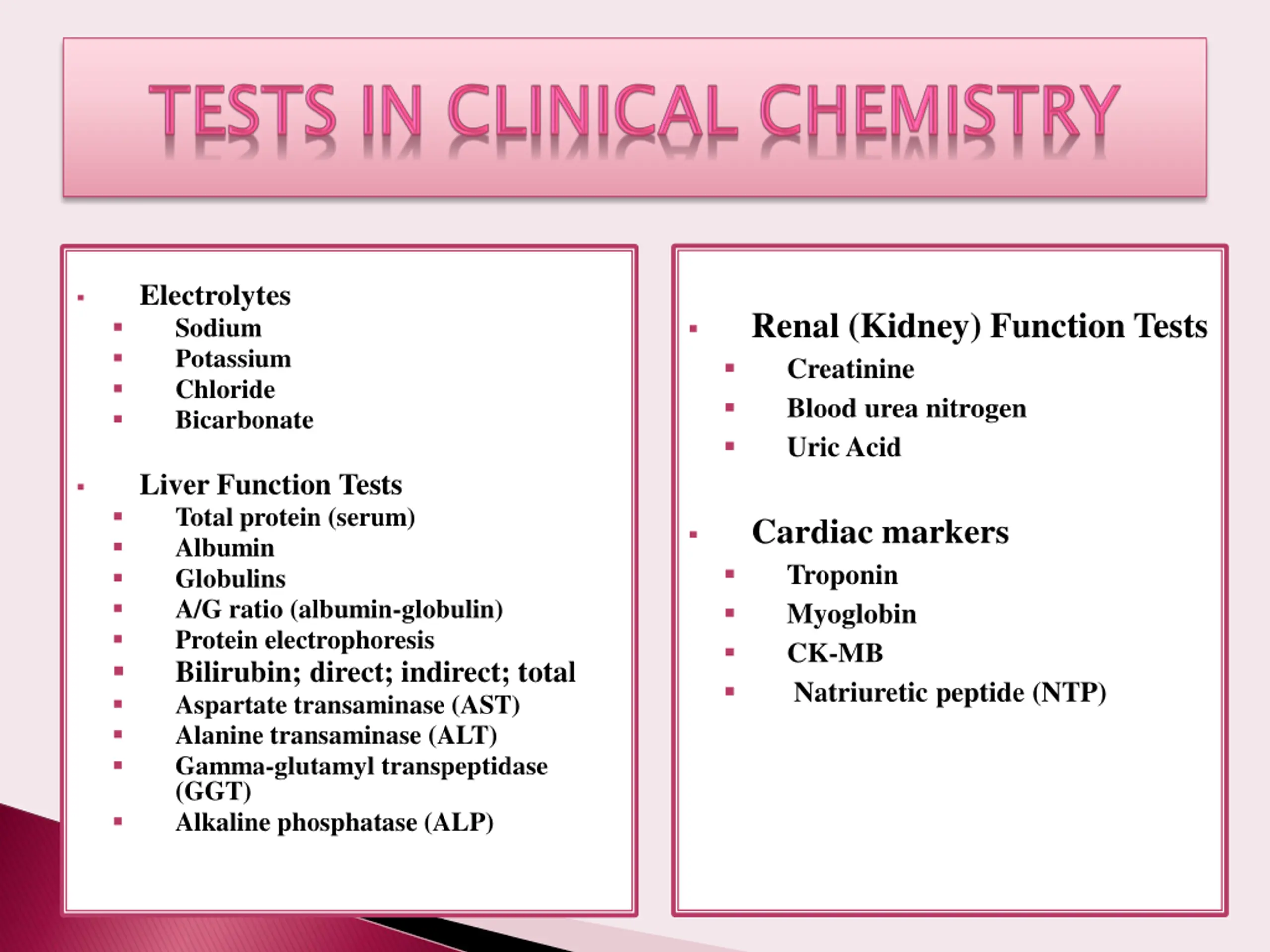 Electrolytes Sodium Potassium Chloride Bicarbonate Renal (Kidney) Function Tests Creatinine Blood urea nitrogen Uric Acid Liver Function Tests Total protein (serum) Albumin Globulins A/G ratio (albumin-globulin) Protein electrophoresis Bilirubin; direct; indirect; total Aspartate transaminase (AST) Alanine transaminase (ALT) Gamma-glutamyl transpeptidase (GGT) Alkaline phosphatase (ALP) Cardiac markers Troponin Myoglobin CK-MB Natriuretic peptide (NTP)