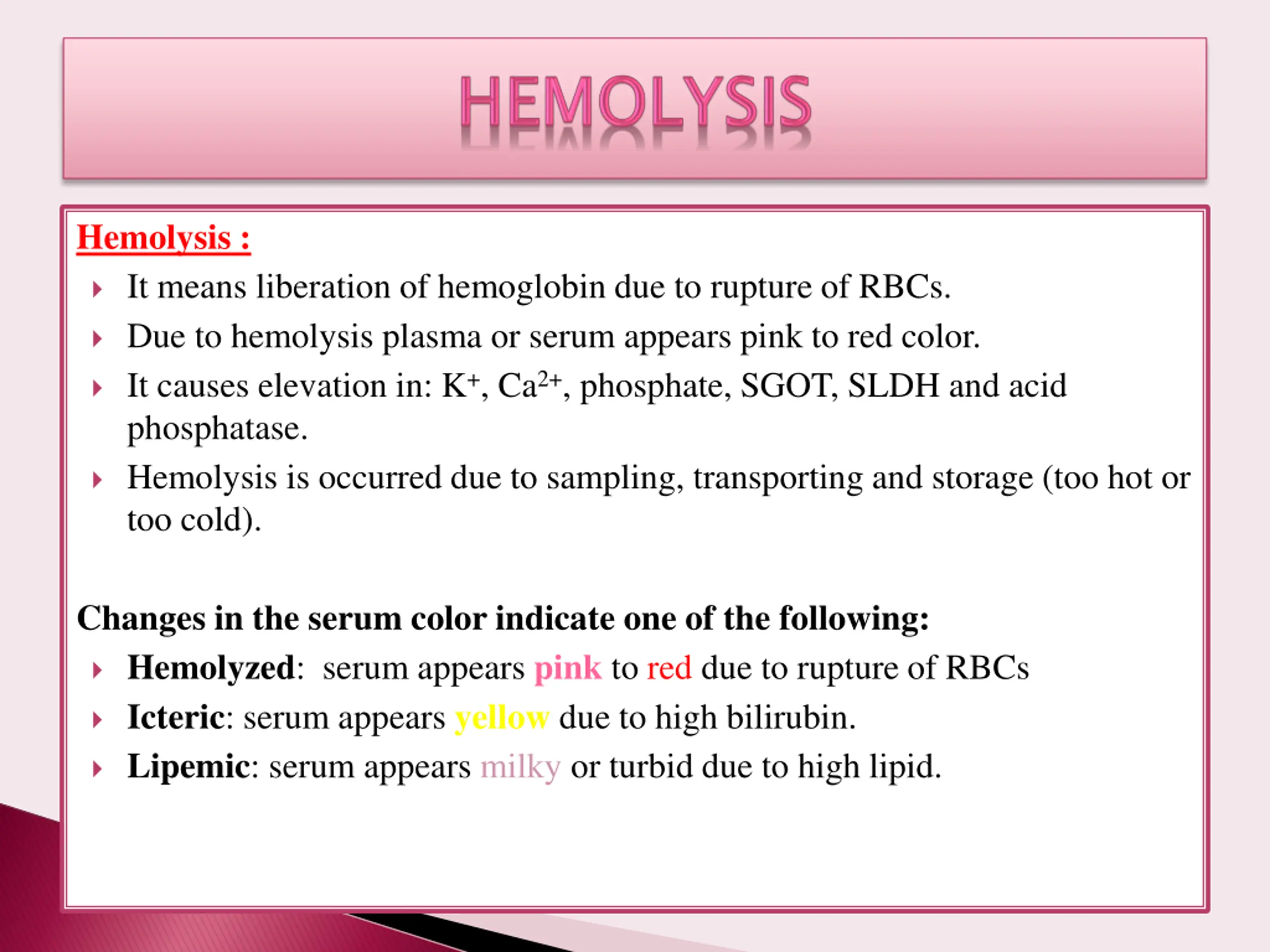 Hemolysis : It means liberation of hemoglobin due to rupture of RBCs. Due to hemolysis plasma or serum appears pink to red color. It causes elevation in: K+, Ca2+, phosphate, SGOT, SLDH and acid phosphatase. Hemolysis is occurred due to sampling, transporting and storage (too hot or too cold). Changes in the serum color indicate one of the following: Hemolyzed: serum appears pink to red due to rupture of RBCs Icteric: serum appears yellow due to high bilirubin. Lipemic: serum appears milky or turbid due to high lipid.
