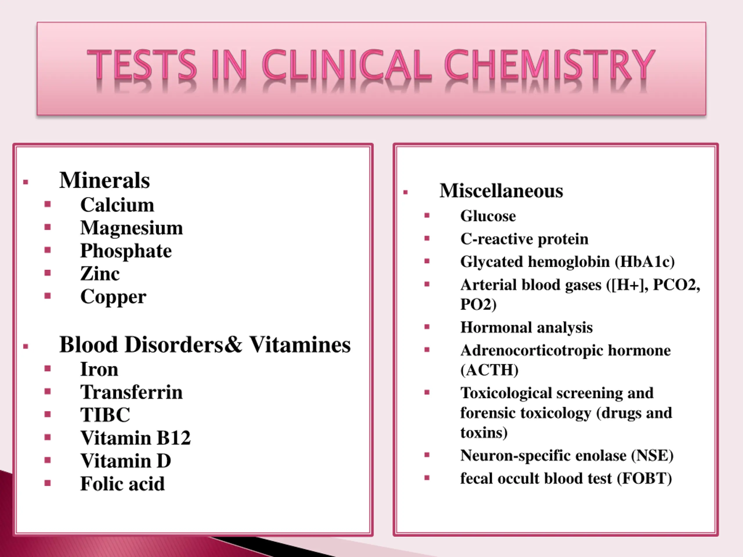 Minerals Calcium Magnesium Phosphate Zinc Copper Miscellaneous Glucose C-reactive protein Glycated hemoglobin (HbA1c) Arterial blood gases ([H+], PCO2, PO2) Hormonal analysis Adrenocorticotropic hormone (ACTH) Toxicological screening and forensic toxicology (drugs and toxins) Neuron-specific enolase (NSE) fecal occult blood test (FOBT) Blood Disorders& Vitamines Iron Transferrin TIBC Vitamin B12 Vitamin D Folic acid