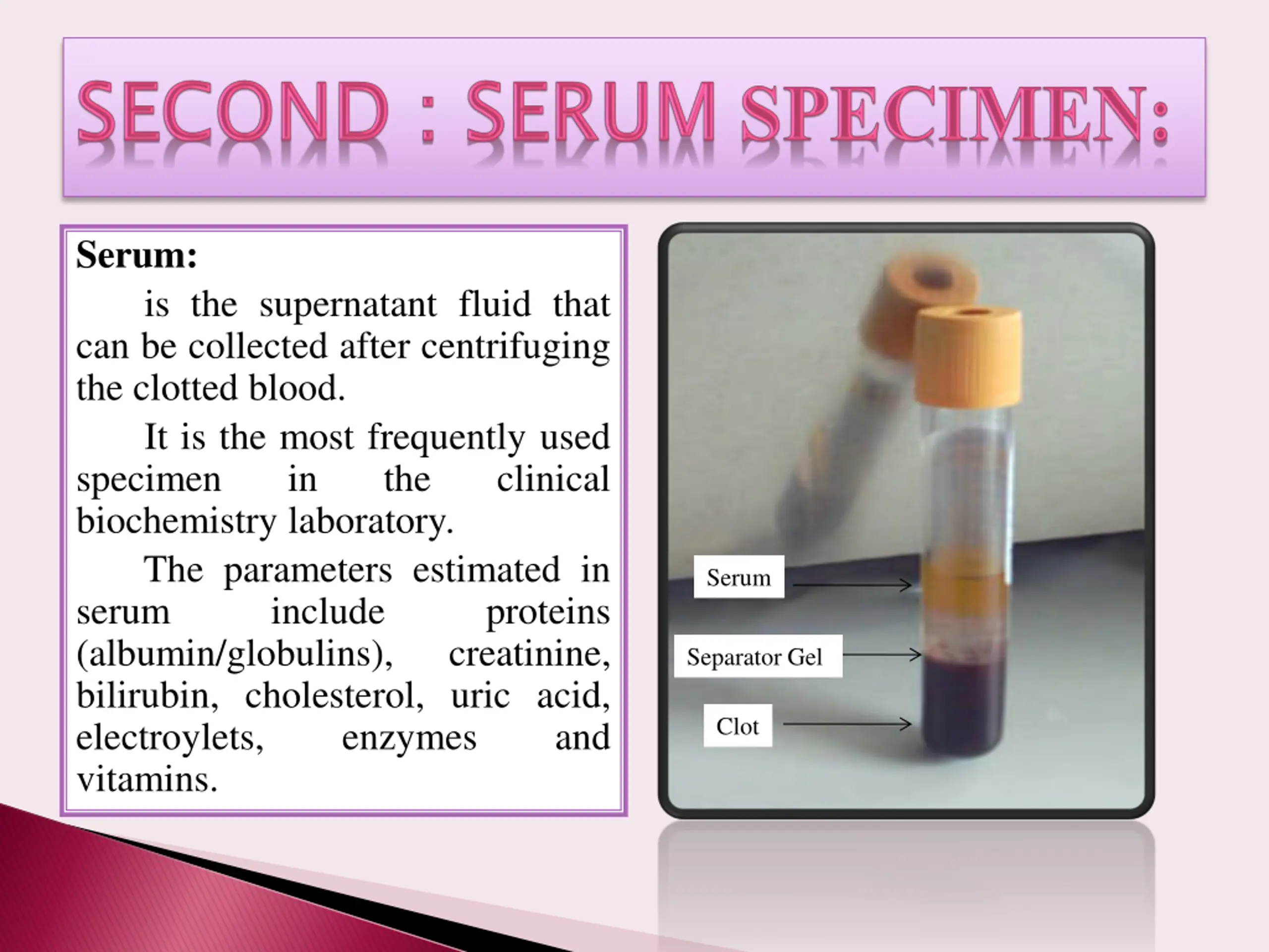 Serum: is the supernatant fluid that can be collected after centrifuging the clotted blood. It is the most frequently used specimen in biochemistry laboratory. The parameters estimated in serum include (albumin/globulins), bilirubin, cholesterol, uric acid, electroylets, enzymes vitamins. the clinical Serum proteins creatinine, Separator Gel Clot and