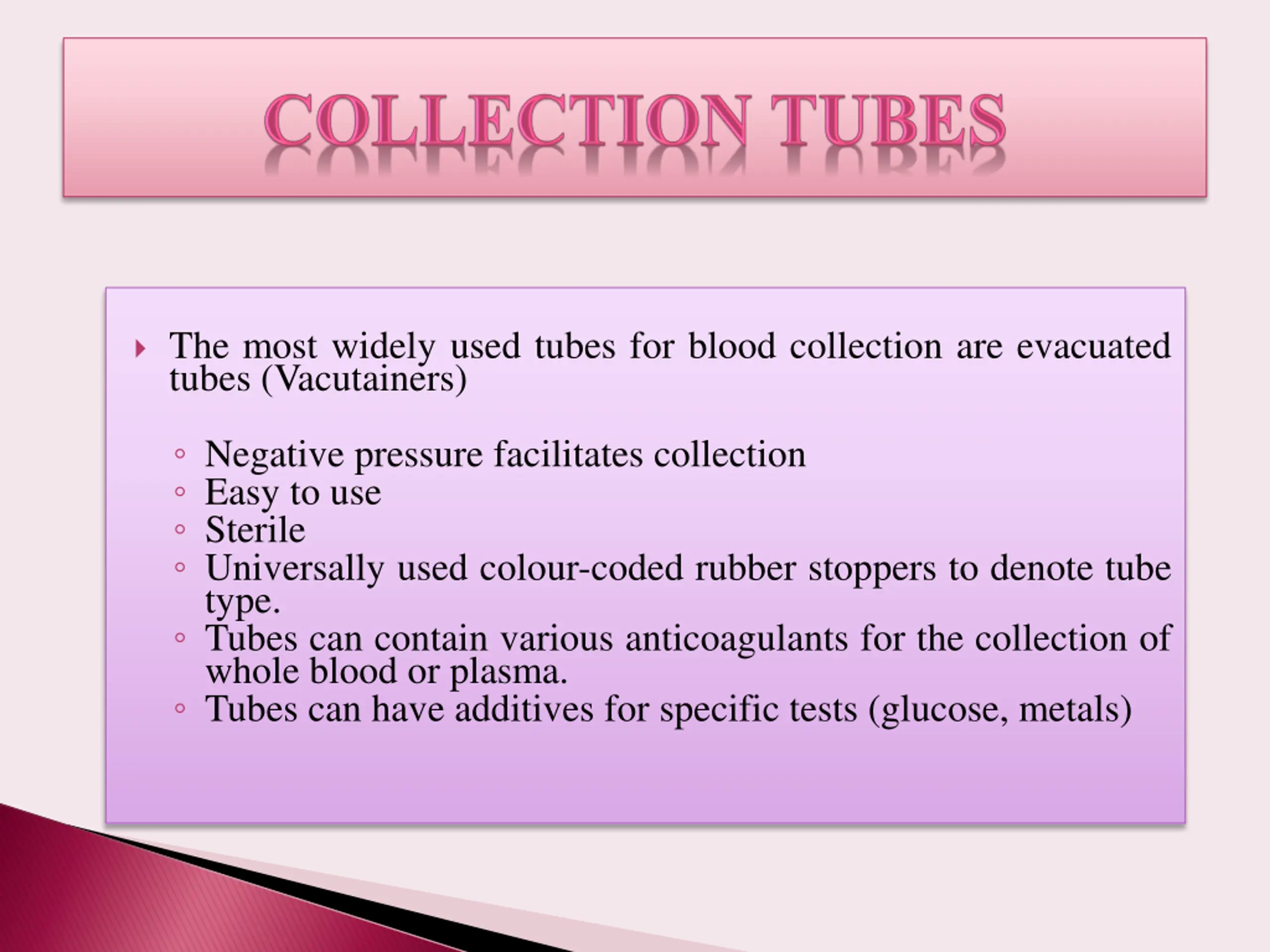 The most widely used tubes for blood collection are evacuated tubes (Vacutainers) Negative pressure facilitates collection Easy to use Sterile Universally used colour-coded rubber stoppers to denote tube type. Tubes can contain various anticoagulants for the collection of whole blood or plasma. Tubes can have additives for specific tests (glucose, metals)