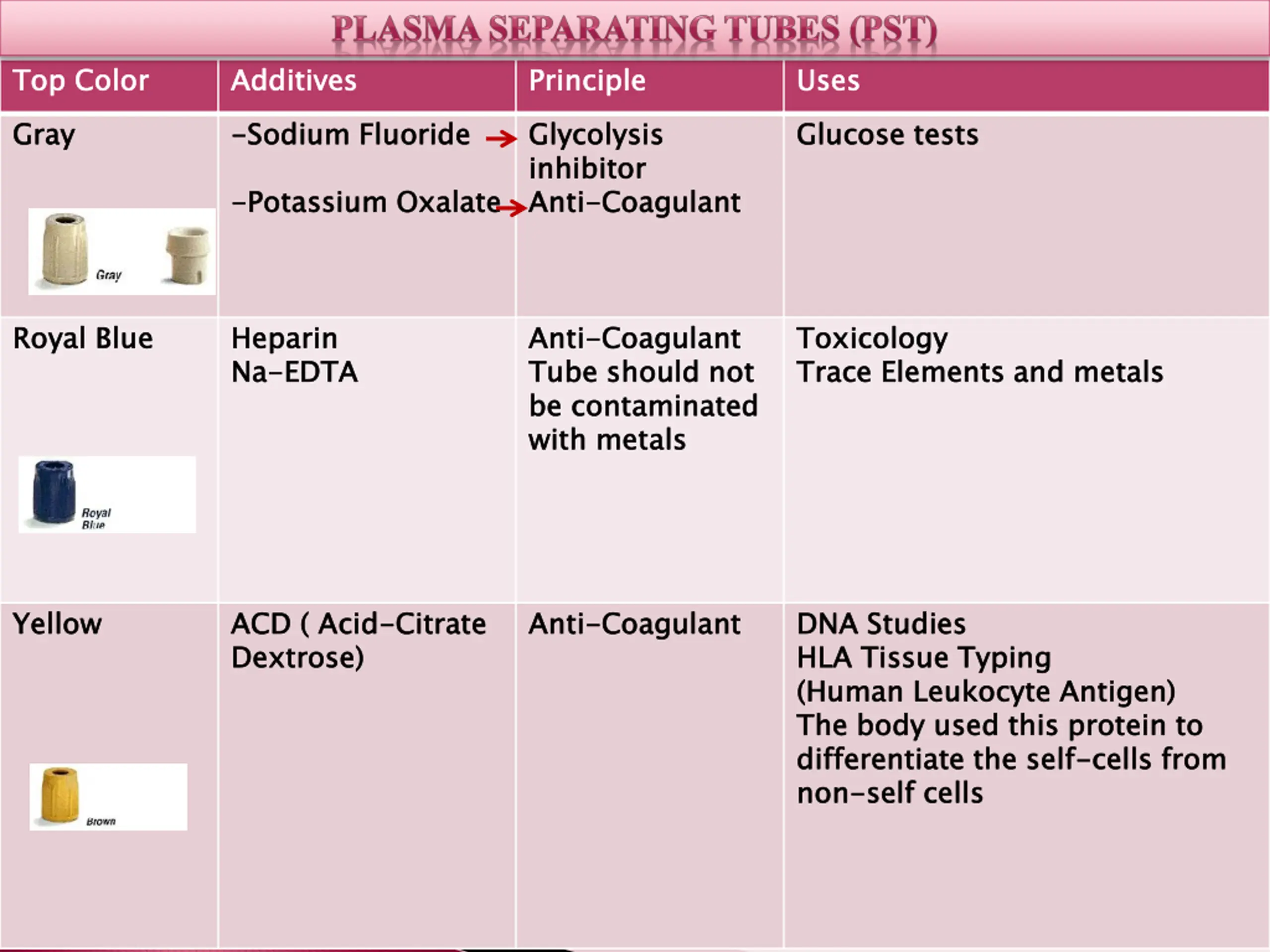 Top Color Gray Top Color Gray Additives - -Sodium Fluoride Additives Sodium Fluoride Principle Glycolysis inhibitor Anti Principle Glycolysis inhibitor Anti- -Coagulant Uses Glucose tests Uses Glucose tests - -Potassium Oxalate Potassium Oxalate Coagulant Royal Blue Royal Blue Heparin Na Heparin Na- -EDTA Anti Tube should not be contaminated with metals Anti- -Coagulant Tube should not be contaminated with metals Coagulant Toxicology Trace Toxicology Trace Elements and metals EDTA Elements and metals Yellow Yellow ACD ( Acid- -Citrate Dextrose) ACD ( Acid Dextrose) Citrate Anti Anti- -Coagulant Coagulant DNA HLA Tissue Typing (Human Leukocyte Antigen) The body used this protein to differentiate the self non DNA Studies HLA Tissue Typing (Human Leukocyte Antigen) The body used this protein to differentiate the self- -cells from non- -self cells Studies cells from self cells