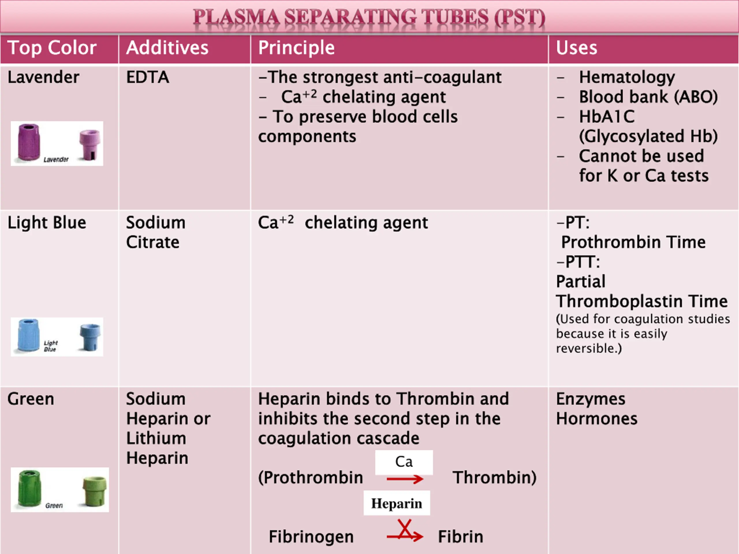 Top Color Lavender Top Color Lavender Additives EDTA Additives EDTA Principle - -The strongest anti - Ca - - To preserve blood cells components Principle The strongest anti- -coagulant Ca+2 To preserve blood cells components Uses - Hematology - Blood bank (ABO) - HbA1C (Glycosylated - Cannot be used for K or Ca tests Uses coagulant Hematology Blood bank (ABO) HbA1C (Glycosylated Hb Cannot be used for K or Ca tests +2 chelating agent chelating agent Hb) ) Light Blue Light Blue Sodium Citrate Sodium Citrate Ca Ca+2 +2 chelating agent chelating agent -PT: Prothrombin -PTT: Partial Thromboplastin ( (Used for coagulation studies because it is easily reversible.) ) PT: Prothrombin Time PTT: Partial Thromboplastin Time Time Time Green Green Sodium Heparin or Lithium Heparin Sodium Heparin or Lithium Heparin Heparin binds to Thrombin and inhibits coagulation cascade ( (Prothrombin Heparin Heparin binds to Thrombin and inhibits the second step in the coagulation cascade Prothrombin Enzymes Hormones Enzymes Hormones the second step in the Ca Thrombin) Thrombin) Fibrinogen Fibrin Fibrinogen Fibrin