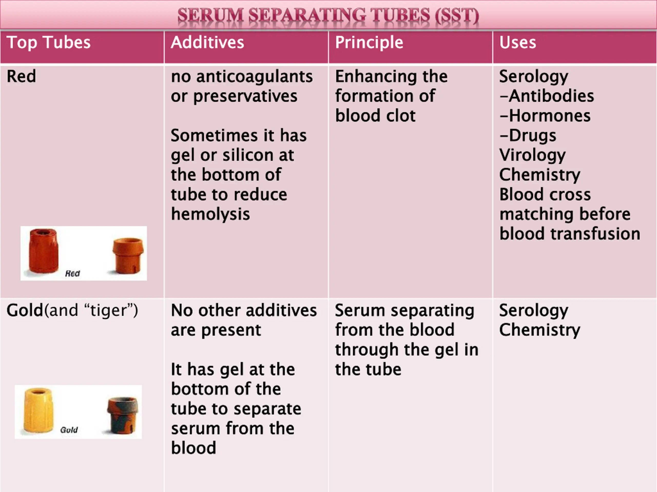 Top Tubes Top Tubes Additives Additives Principle Principle Uses Uses Red Red no anticoagulants or preservatives no anticoagulants or preservatives Enhancing the formation of blood clot Enhancing the formation of blood clot Serology - -Antibodies - -Hormones - -Drugs Virology Chemistry Blood cross matching before blood transfusion Serology Antibodies Hormones Drugs Virology Chemistry Blood cross matching before blood transfusion Sometimes it has gel or silicon at the bottom of tube to reduce hemolysis Sometimes it has gel or silicon at the bottom of tube to reduce hemolysis Gold Gold(and tiger ) No other additives are present No other additives are present Serum separating from the blood through the gel in the tube Serum separating from the blood through the gel in the tube Serology Chemistry Serology Chemistry It has gel at the bottom of the tube to separate serum from the blood It has gel at the bottom of the tube to separate serum from the blood
