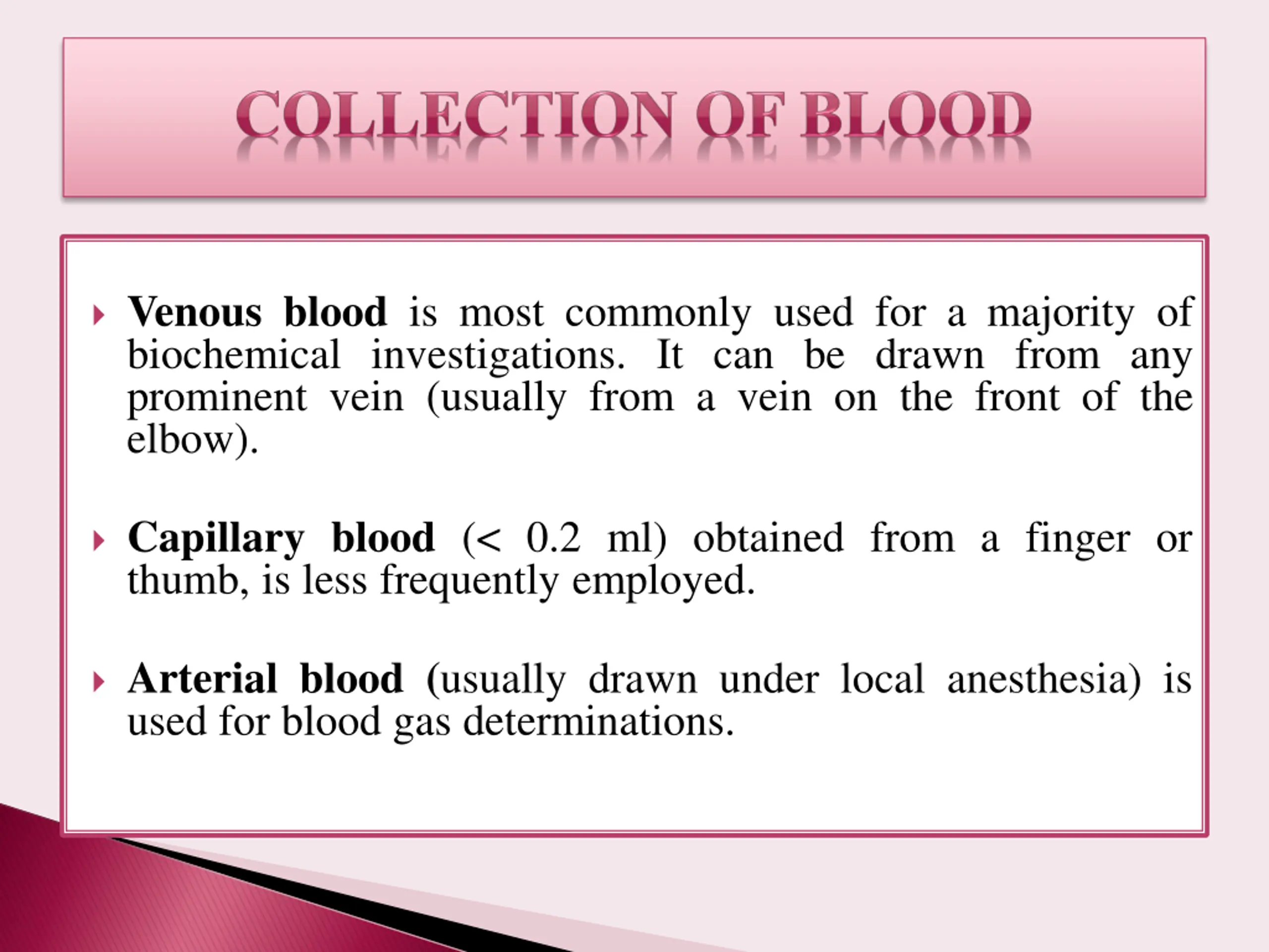 Venous blood is most commonly used for a majority of biochemical investigations. It can be drawn from any prominent vein (usually from a vein on the front of the elbow). Capillary blood (< 0.2 ml) obtained from a finger or thumb, is less frequently employed. Arterial blood (usually drawn under local anesthesia) is used for blood gas determinations.
