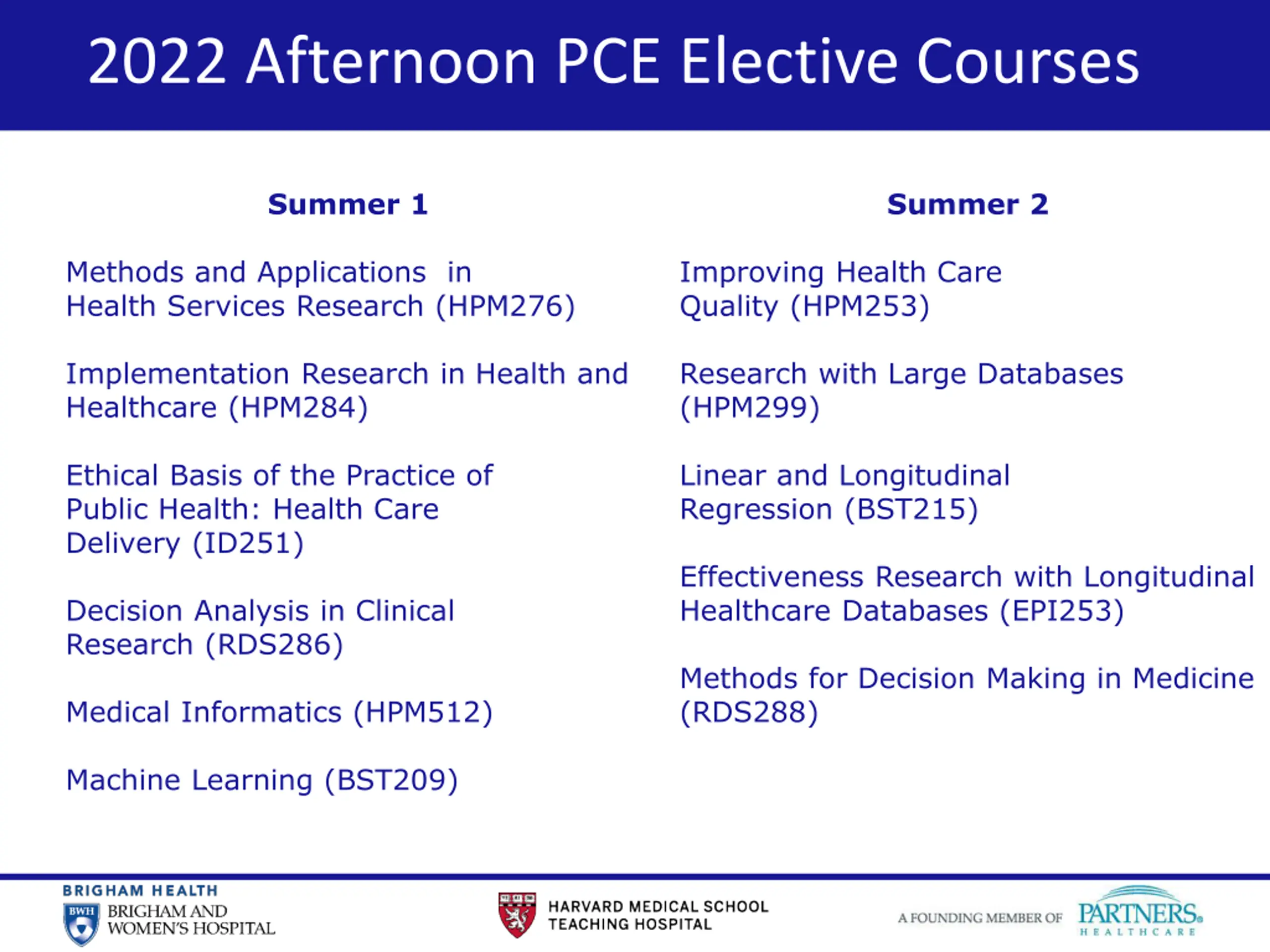 2022 Afternoon PCE Elective Courses Summer 1 Summer 2 Methods and Applications in Health Services Research (HPM276) Improving Health Care Quality (HPM253) Implementation Research in Health and Healthcare (HPM284) Research with Large Databases (HPM299) Ethical Basis of the Practice of Public Health: Health Care Delivery (ID251) Linear and Longitudinal Regression (BST215) Effectiveness Research with Longitudinal Healthcare Databases (EPI253) Decision Analysis in Clinical Research (RDS286) Methods for Decision Making in Medicine (RDS288) Medical Informatics (HPM512) Machine Learning (BST209)