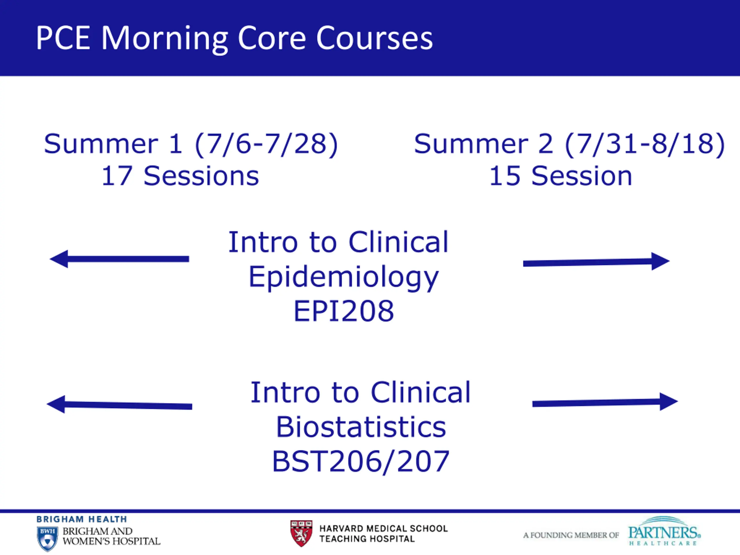 PCE Morning Core Courses Summer 1 (7/6-7/28) 17 Sessions Summer 2 (7/31-8/18) 15 Session Intro to Clinical Epidemiology EPI208 Intro to Clinical Biostatistics BST206/207