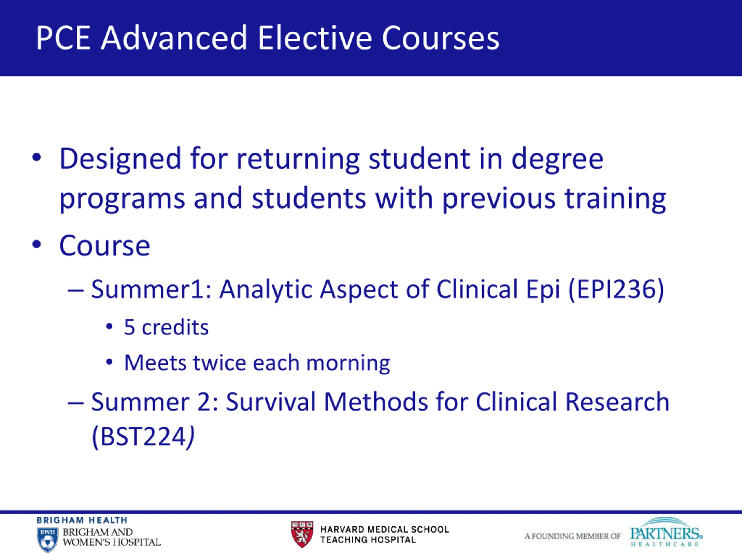 11 PCE Advanced Elective Courses Designed for returning student in degree programs and students with previous training Course Summer1: Analytic Aspect of Clinical Epi (EPI236) 5 credits Meets twice each morning Summer 2: Survival Methods for Clinical Research (BST224)