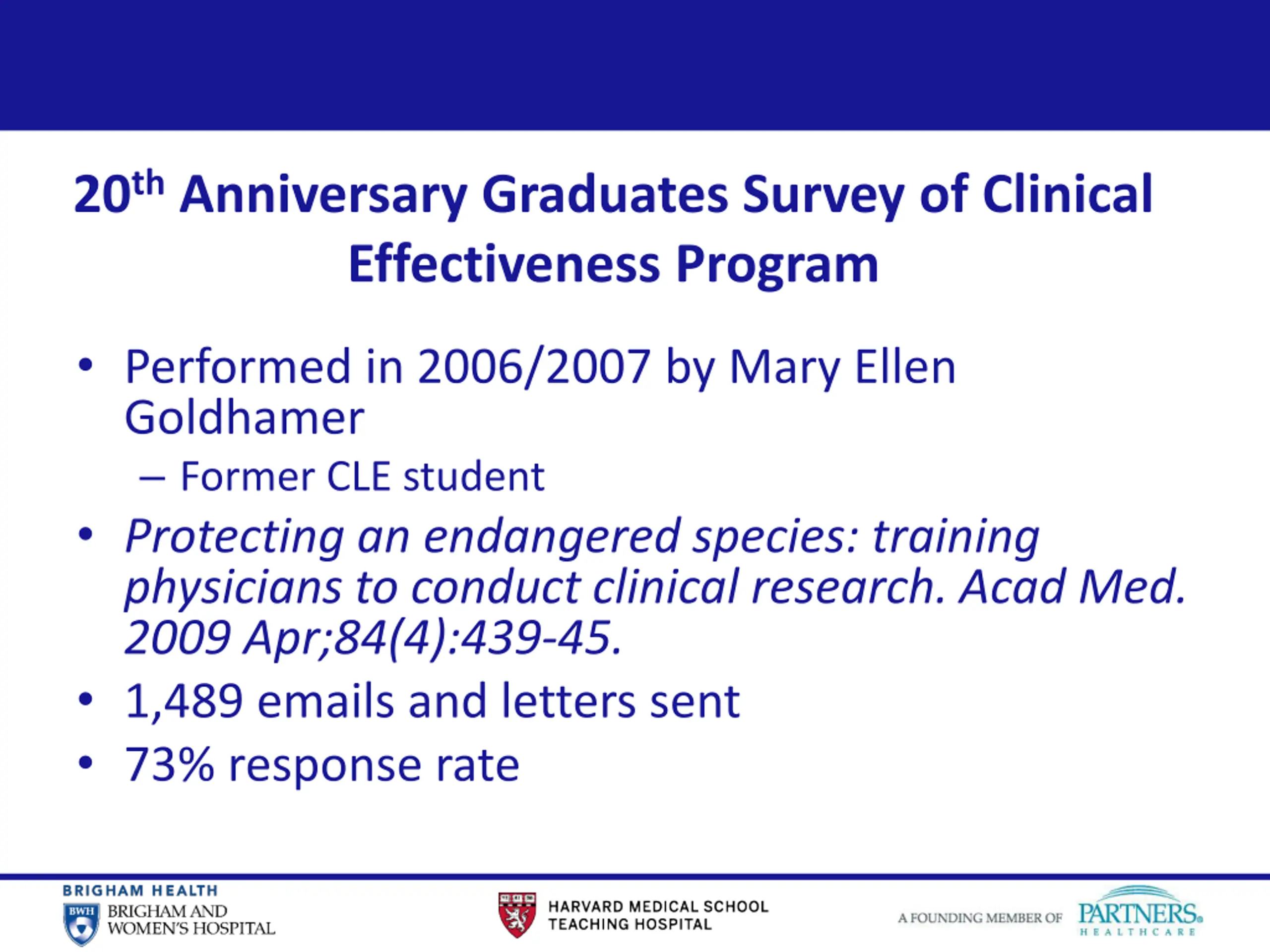 13 20th Anniversary Graduates Survey of Clinical Effectiveness Program Performed in 2006/2007 by Mary Ellen Goldhamer Former CLE student Protecting an endangered species: training physicians to conduct clinical research. Acad Med. 2009 Apr;84(4):439-45. 1,489 emails and letters sent 73% response rate