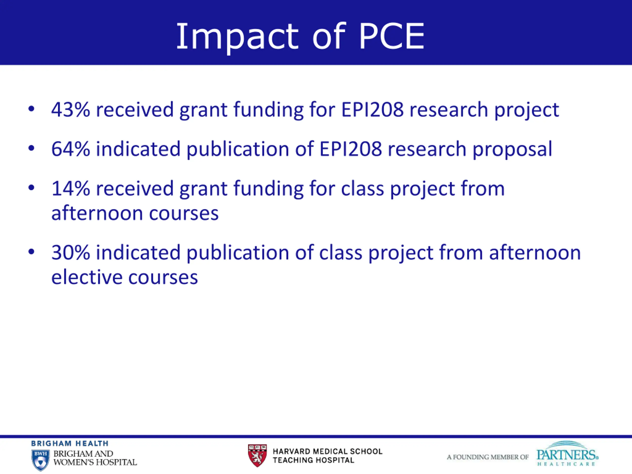 14 Impact of PCE 43% received grant funding for EPI208 research project 64% indicated publication of EPI208 research proposal 14% received grant funding for class project from afternoon courses 30% indicated publication of class project from afternoon elective courses
