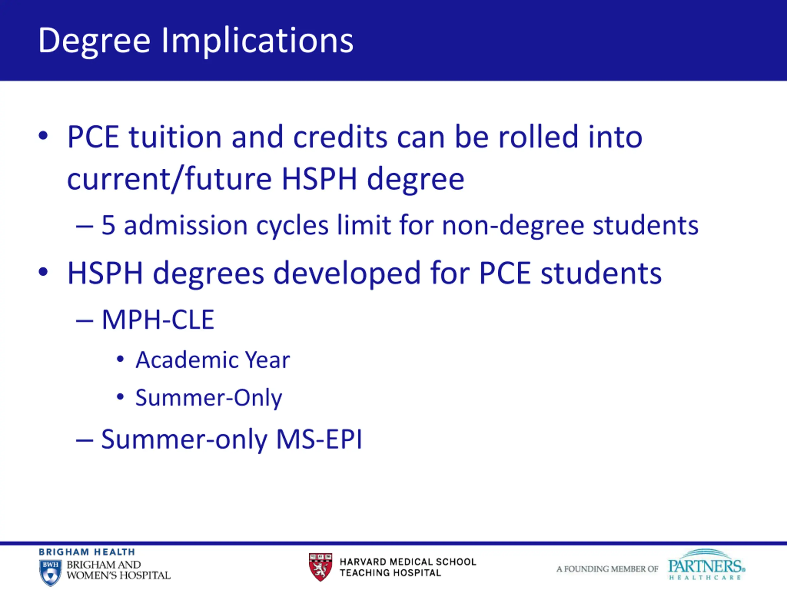 16 Degree Implications PCE tuition and credits can be rolled into current/future HSPH degree 5 admission cycles limit for non-degree students HSPH degrees developed for PCE students MPH-CLE Academic Year Summer-Only Summer-only MS-EPI