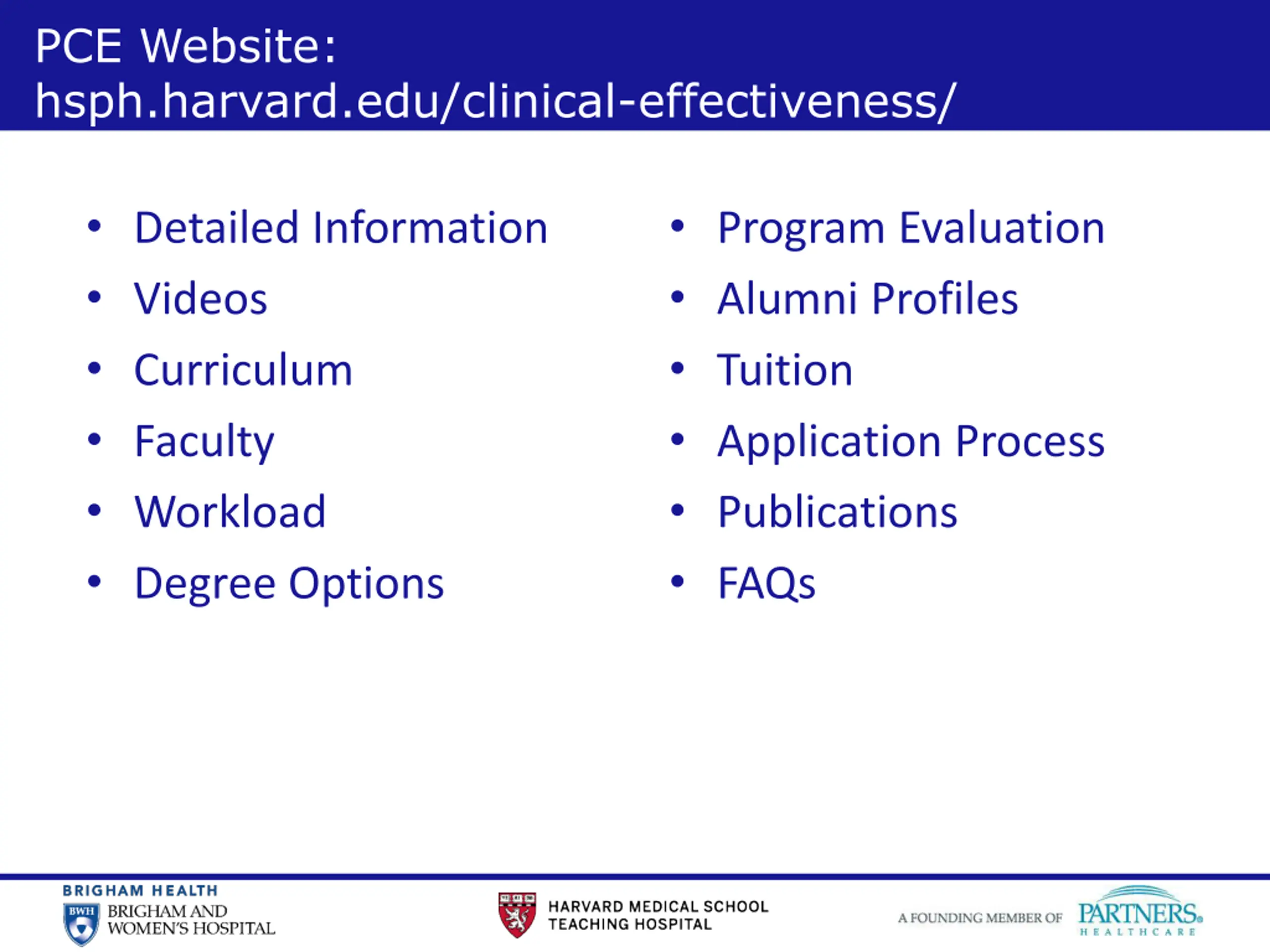 17 PCE Website: hsph.harvard.edu/clinical-effectiveness/ Detailed Information Videos Curriculum Faculty Workload Degree Options Program Evaluation Alumni Profiles Tuition Application Process Publications FAQs