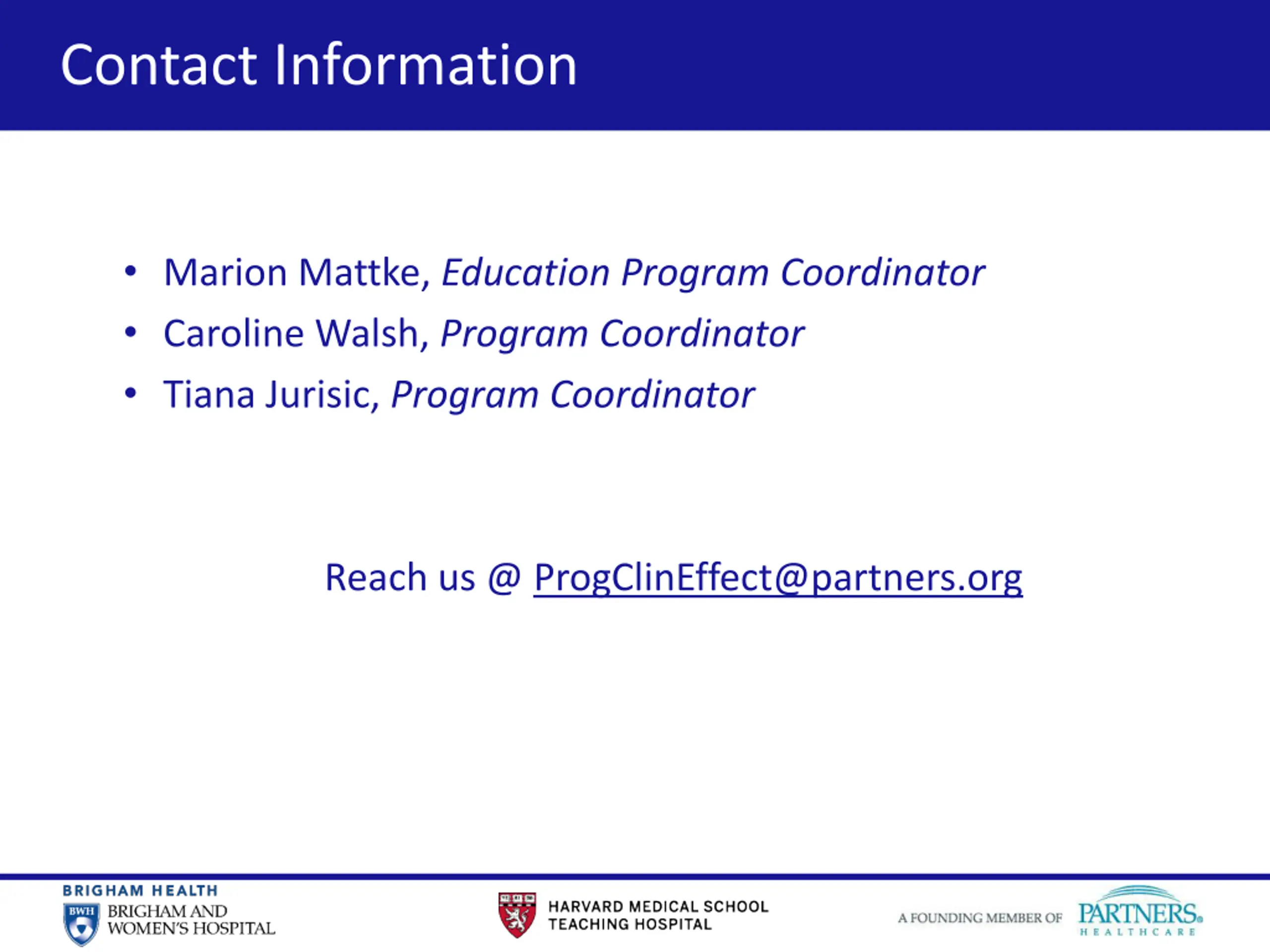 18 Contact Information Marion Mattke, Education Program Coordinator Caroline Walsh, Program Coordinator Tiana Jurisic, Program Coordinator Reach us @ ProgClinEffect@partners.org