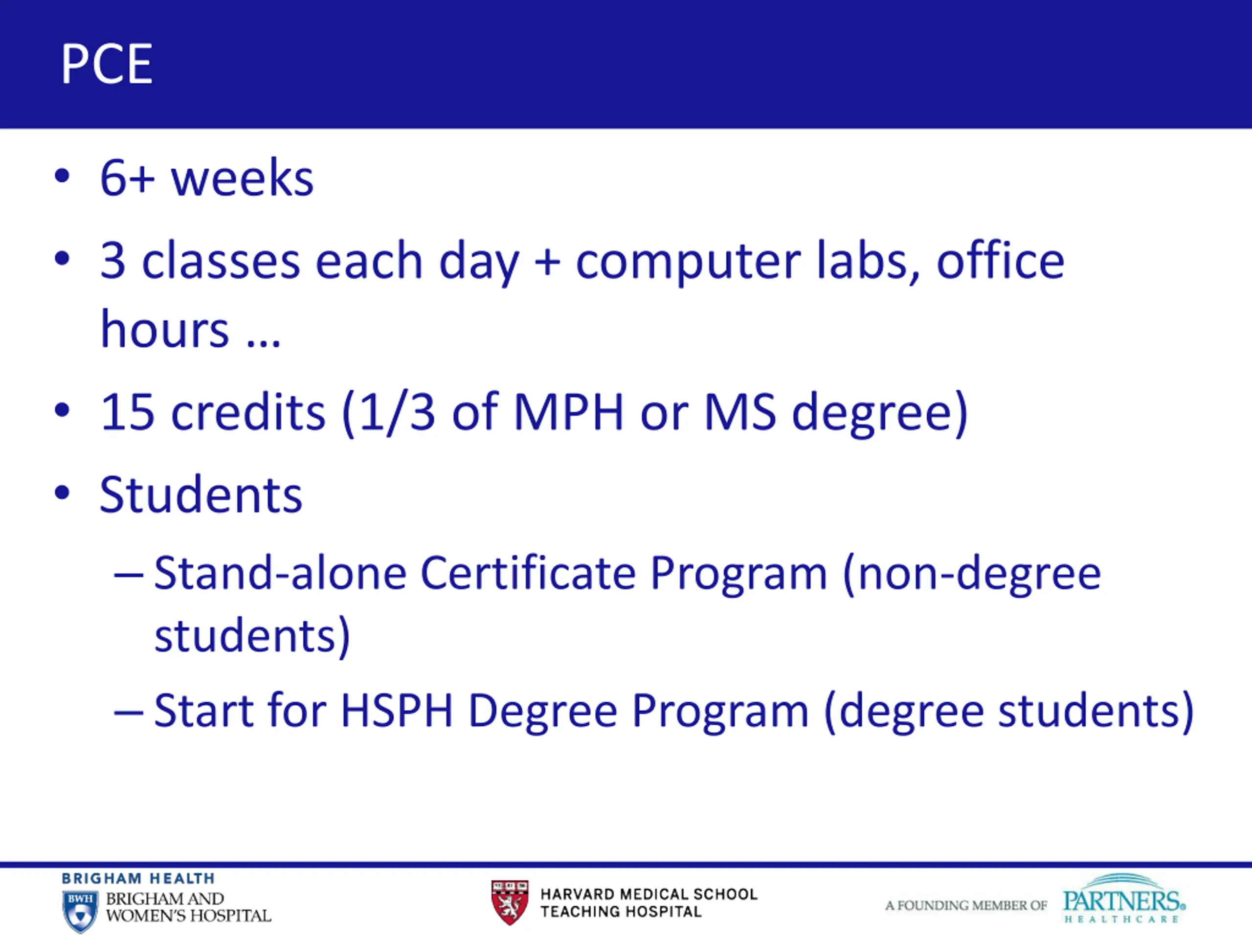 4 PCE 6+ weeks 3 classes each day + computer labs, office hours 15 credits (1/3 of MPH or MS degree) Students Stand-alone Certificate Program (non-degree students) Start for HSPH Degree Program (degree students)