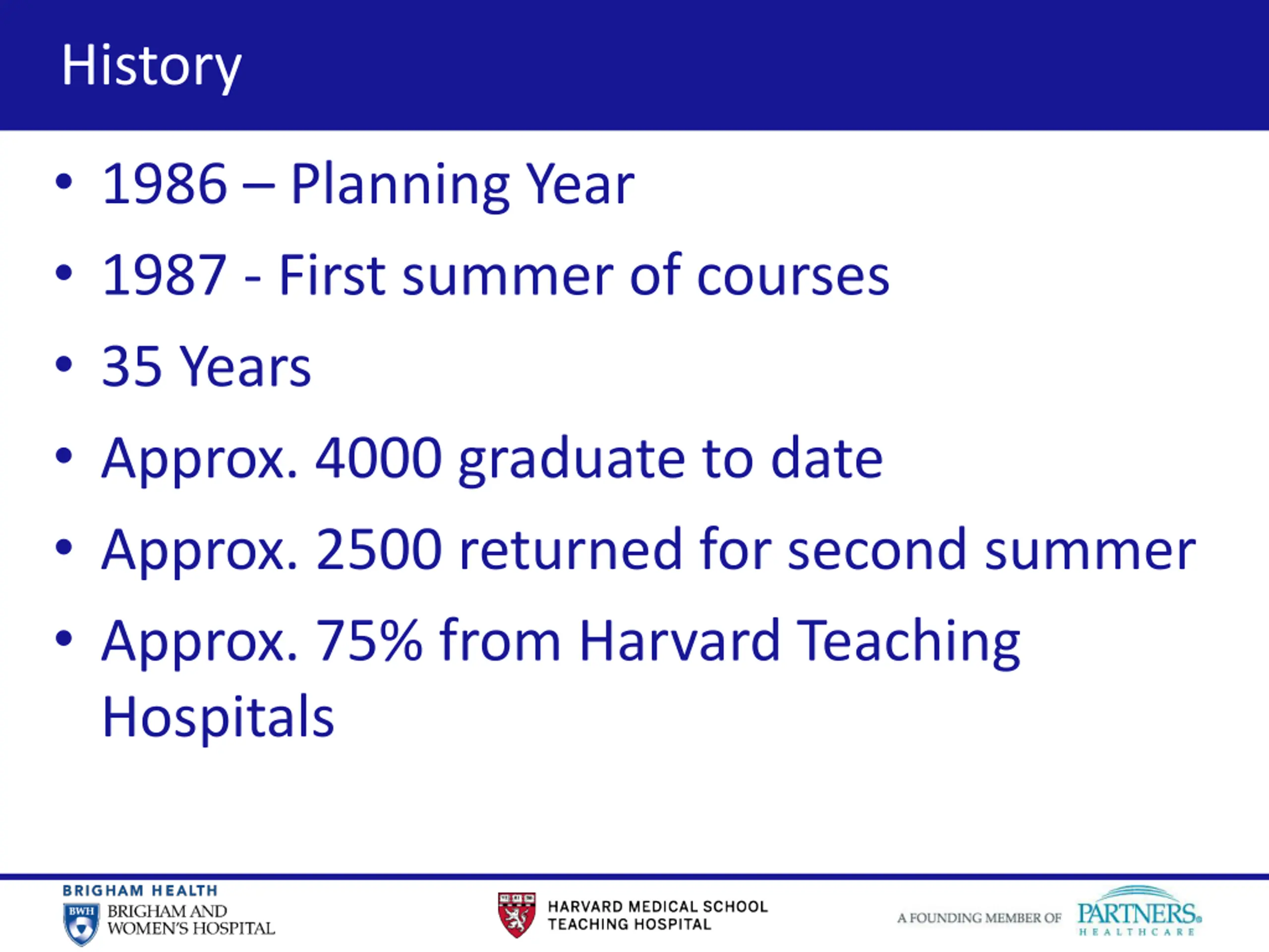 5 History 1986 Planning Year 1987 - First summer of courses 35 Years Approx. 4000 graduate to date Approx. 2500 returned for second summer Approx. 75% from Harvard Teaching Hospitals