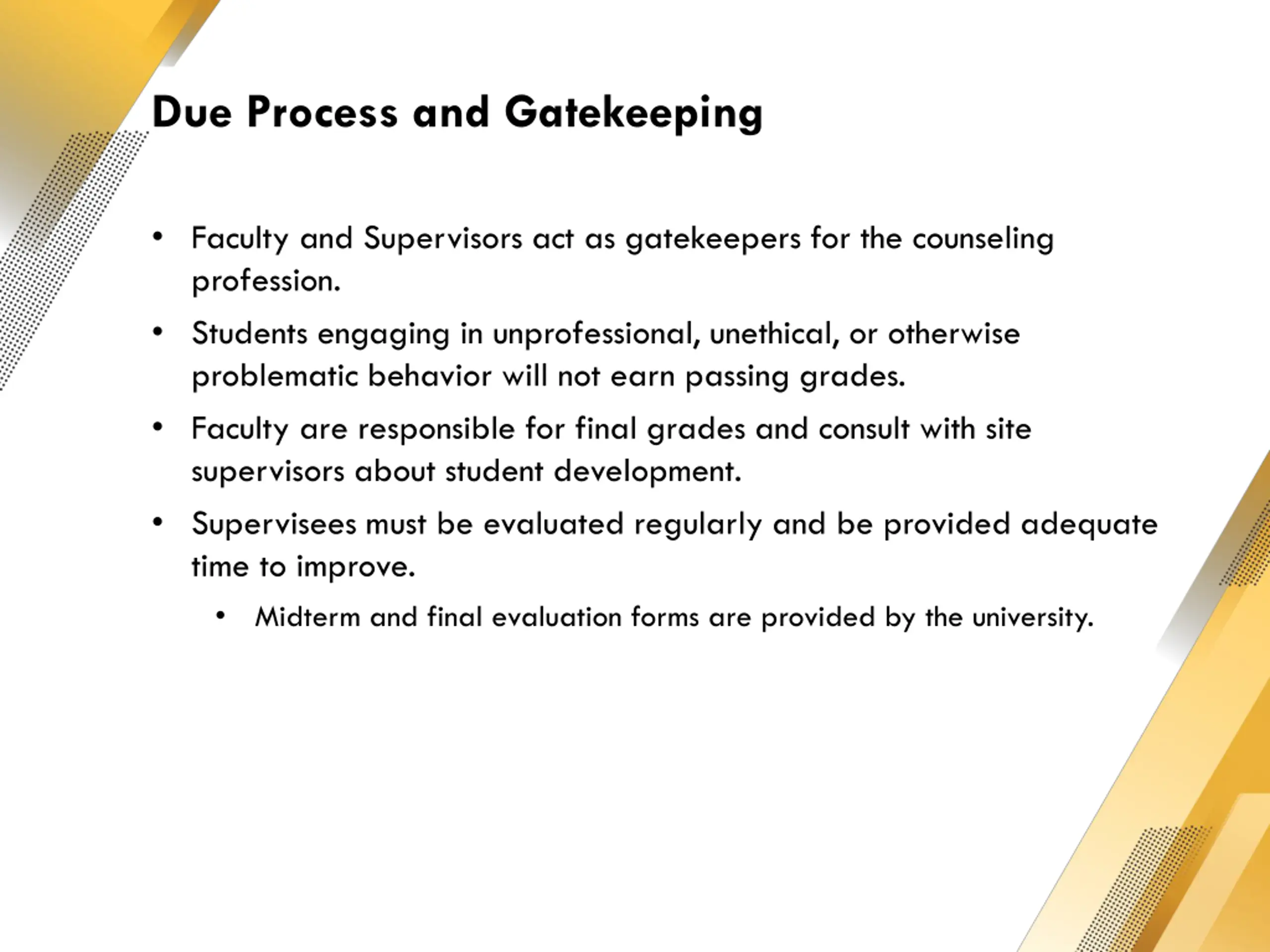 Due Process and Gatekeeping Faculty and Supervisors act as gatekeepers for the counseling profession. Students engaging in unprofessional, unethical, or otherwise problematic behavior will not earn passing grades. Faculty are responsible for final grades and consult with site supervisors about student development. Supervisees must be evaluated regularly and be provided adequate time to improve. Midterm and final evaluation forms are provided by the university.