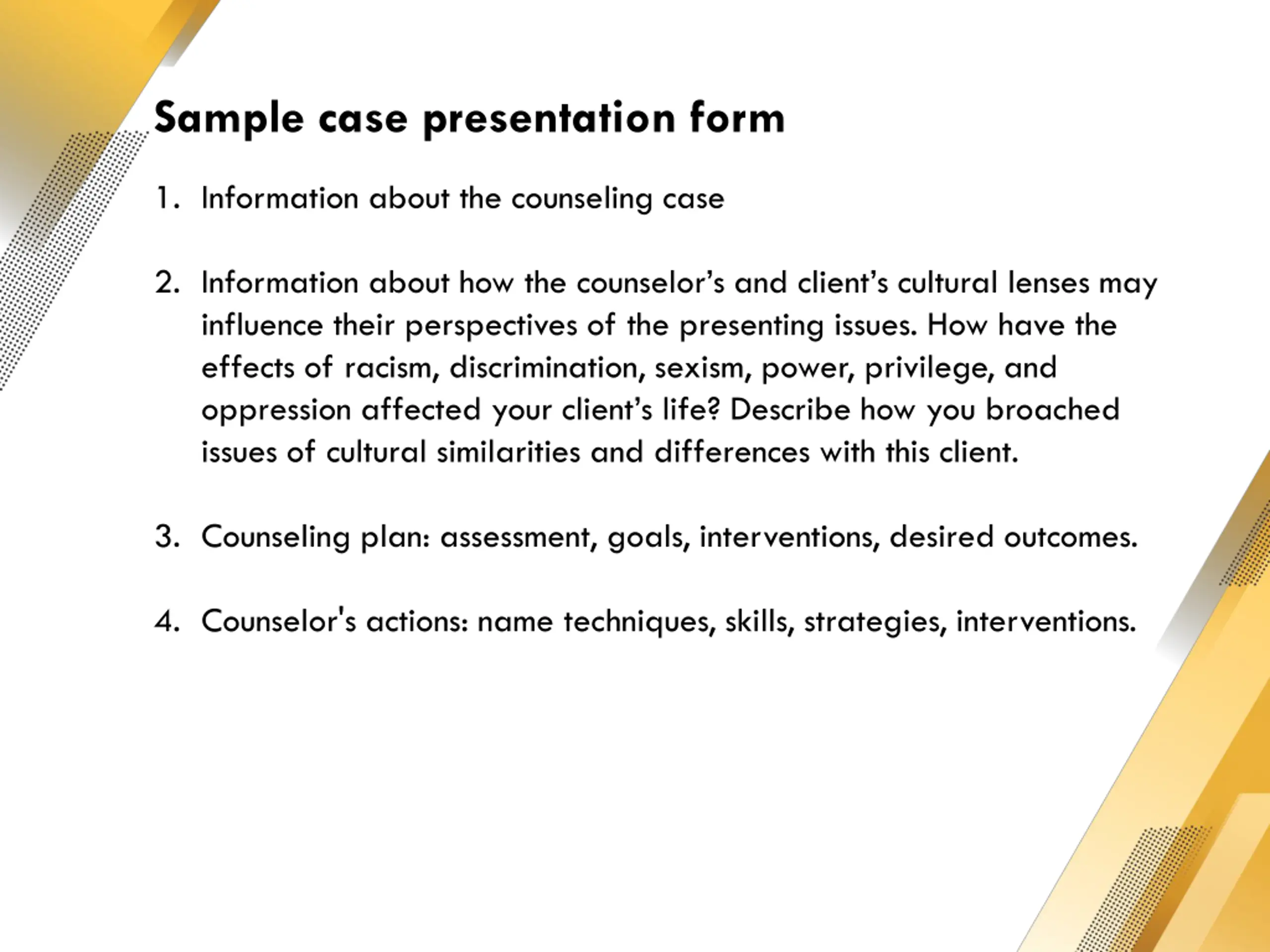 Sample case presentation form 1. Information about the counseling case 2. Information about how the counselor s and client s cultural lenses may influence their perspectives of the presenting issues. How have the effects of racism, discrimination, sexism, power, privilege, and oppression affected your client s life? Describe how you broached issues of cultural similarities and differences with this client. 3. Counseling plan: assessment, goals, interventions, desired outcomes. 4. Counselor's actions: name techniques, skills, strategies, interventions.