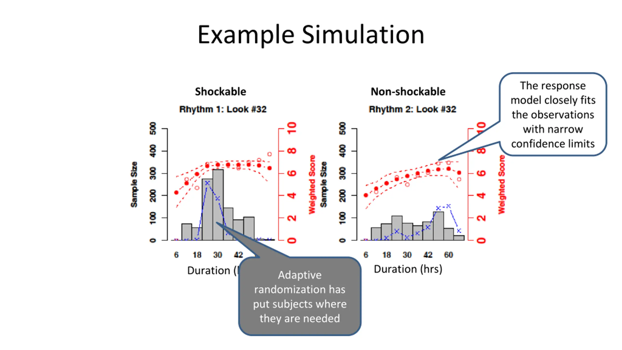 Example Simulation The response model closely fits the observations with narrow confidence limits Shockable Non-shockable Duration (hrs) Duration (hrs) Adaptive randomization has put subjects where they are needed