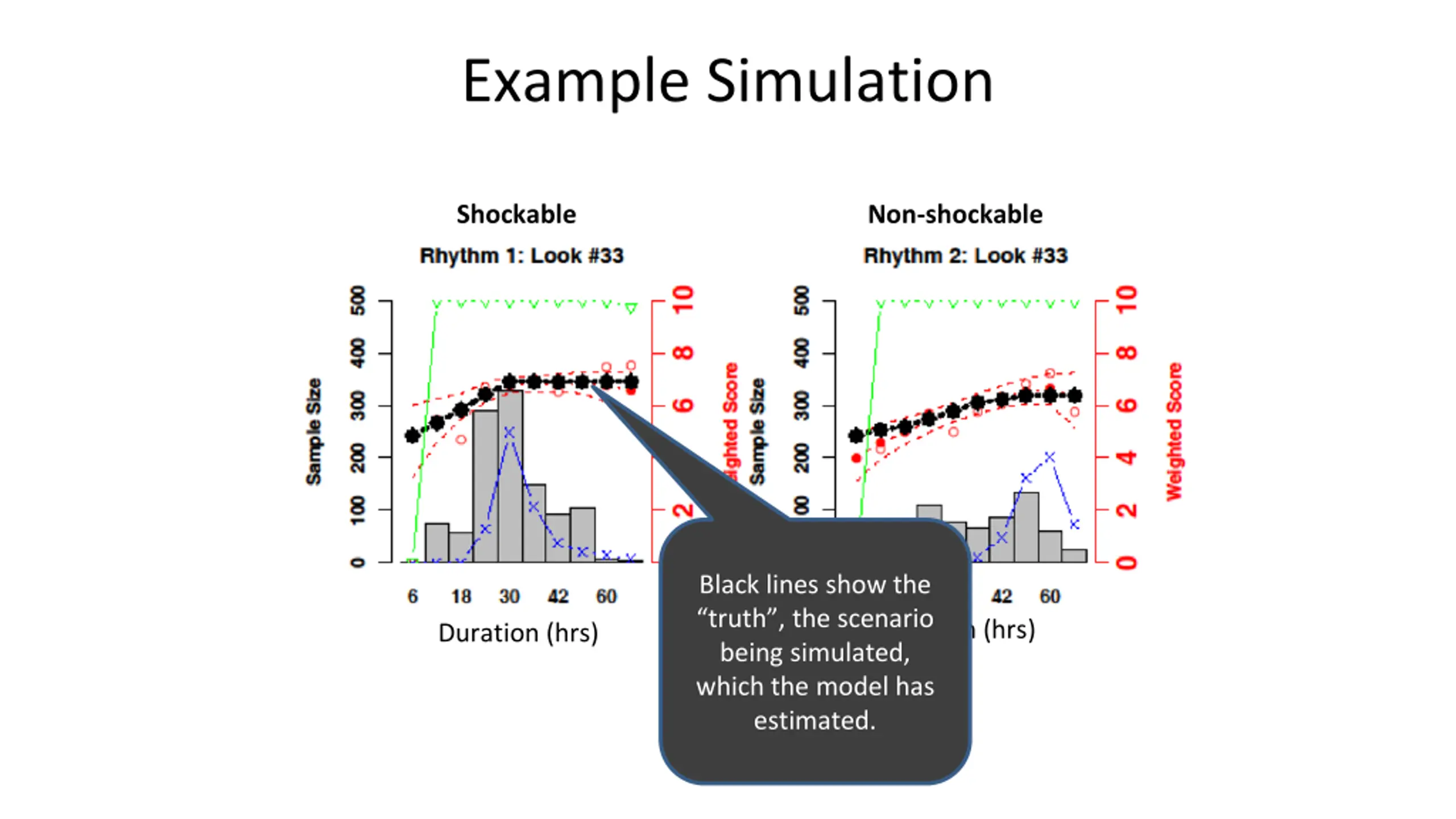 Example Simulation Shockable Non-shockable Black lines show the truth , the scenario being simulated, which the model has estimated. Duration (hrs) Duration (hrs)