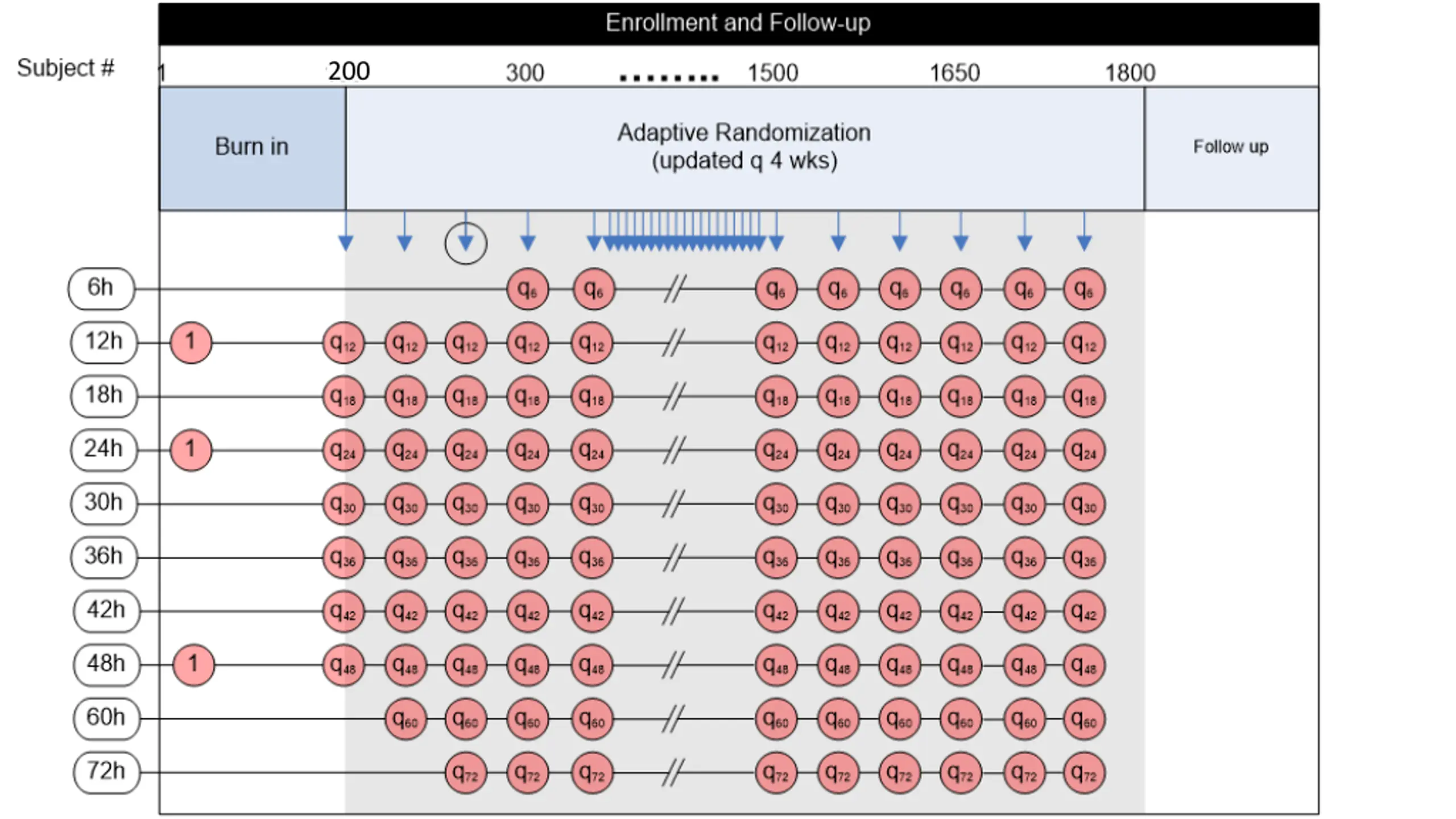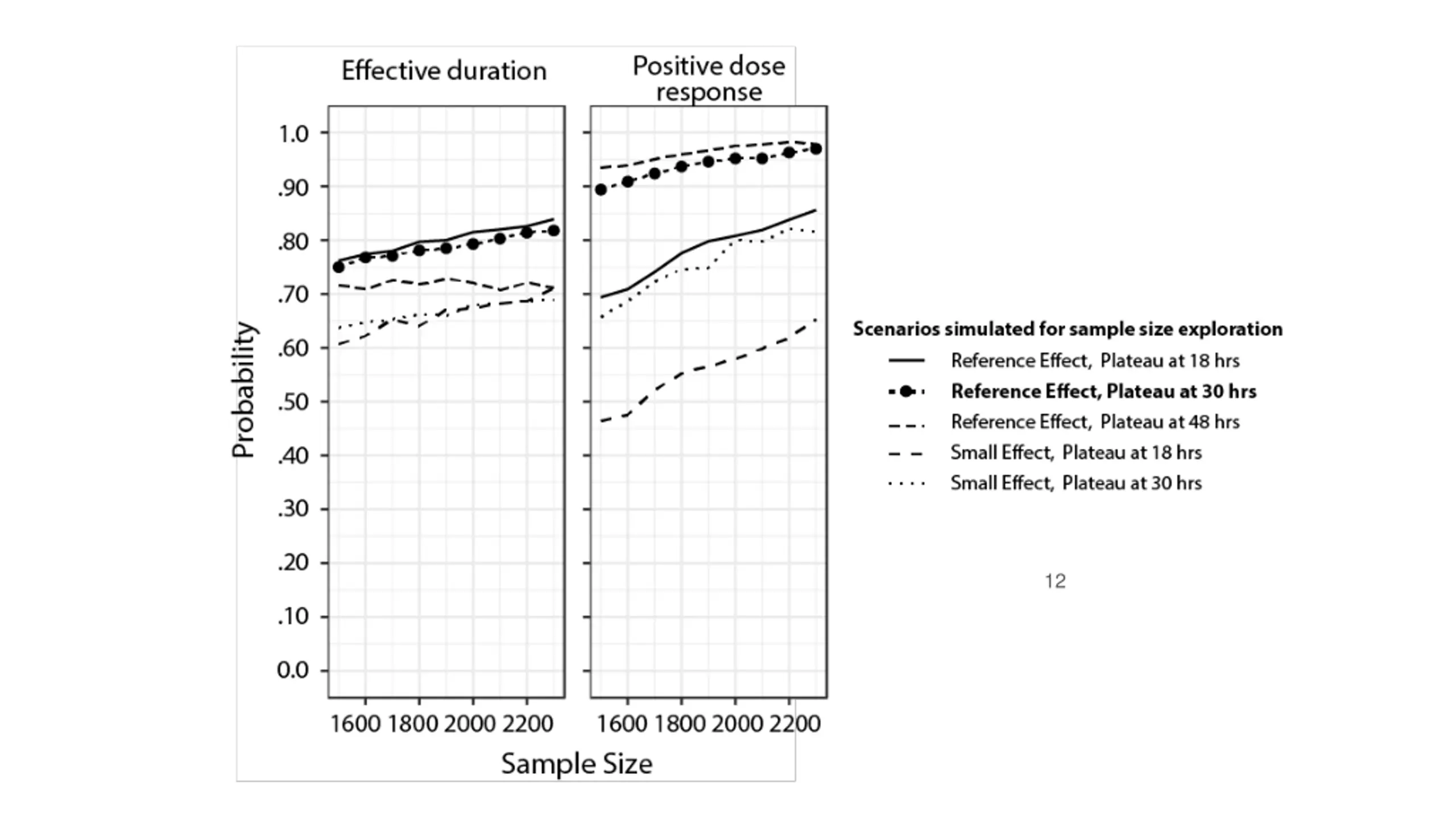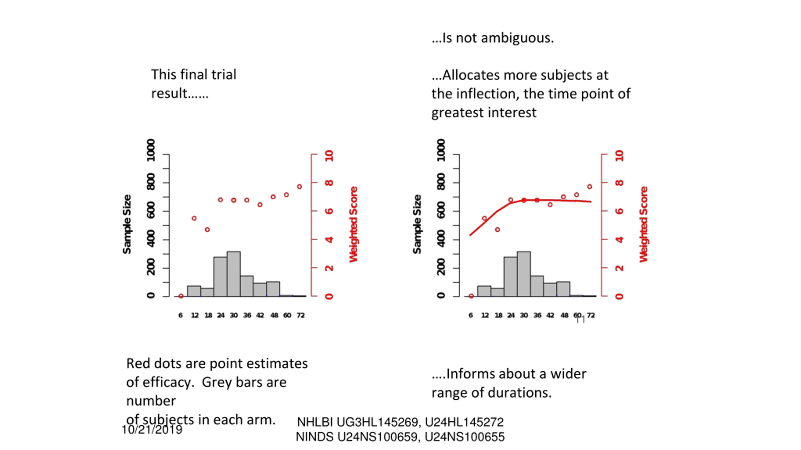Is not ambiguous. This final trial result Allocates more subjects at the inflection, the time point of greatest interest 11 Red dots are point estimates of efficacy. Grey bars are number of subjects in each arm. 10/21/2019 .Informs about a wider range of durations. NHLBI UG3HL145269, U24HL145272 NINDS U24NS100659, U24NS100655