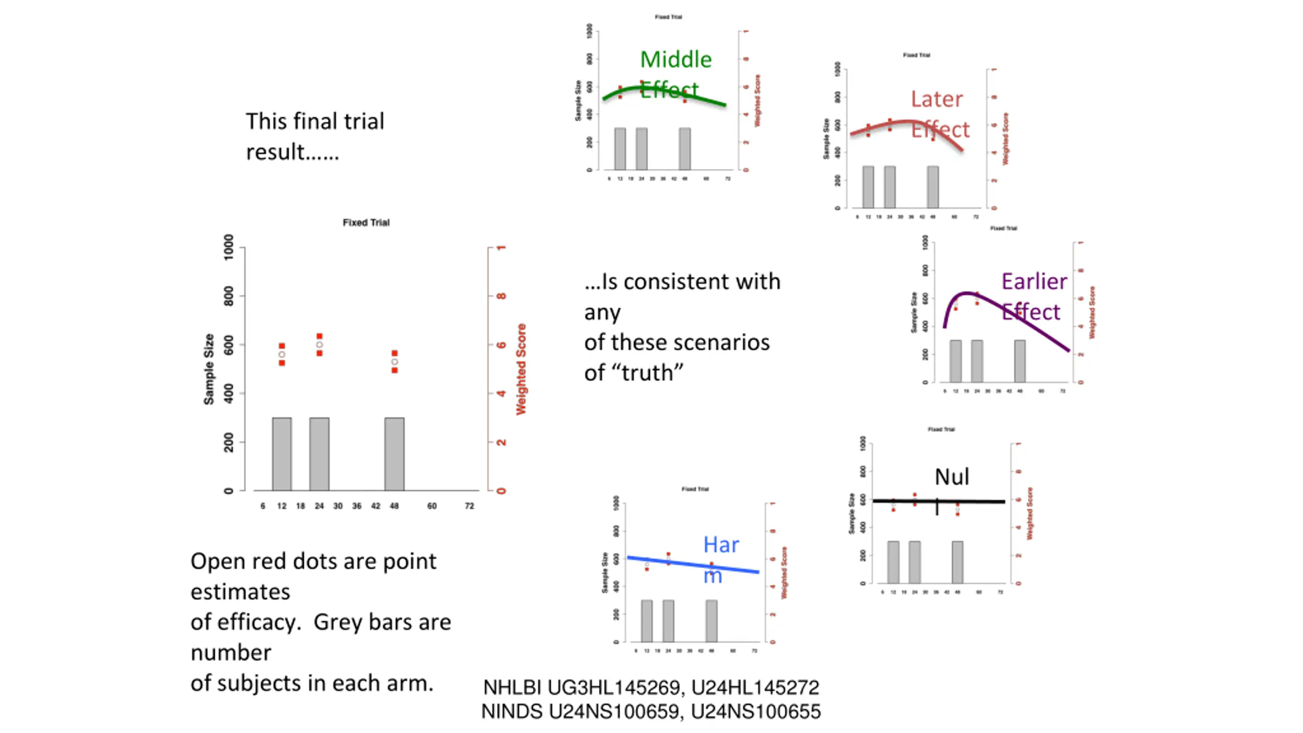 Middle Effect Later Effect This final trial result Earlier Effect Is consistent with any of these scenarios of truth Nul l Har m Open red dots are point estimates of efficacy. Grey bars are number of subjects in each arm. NHLBI UG3HL145269, U24HL145272 NINDS U24NS100659, U24NS100655