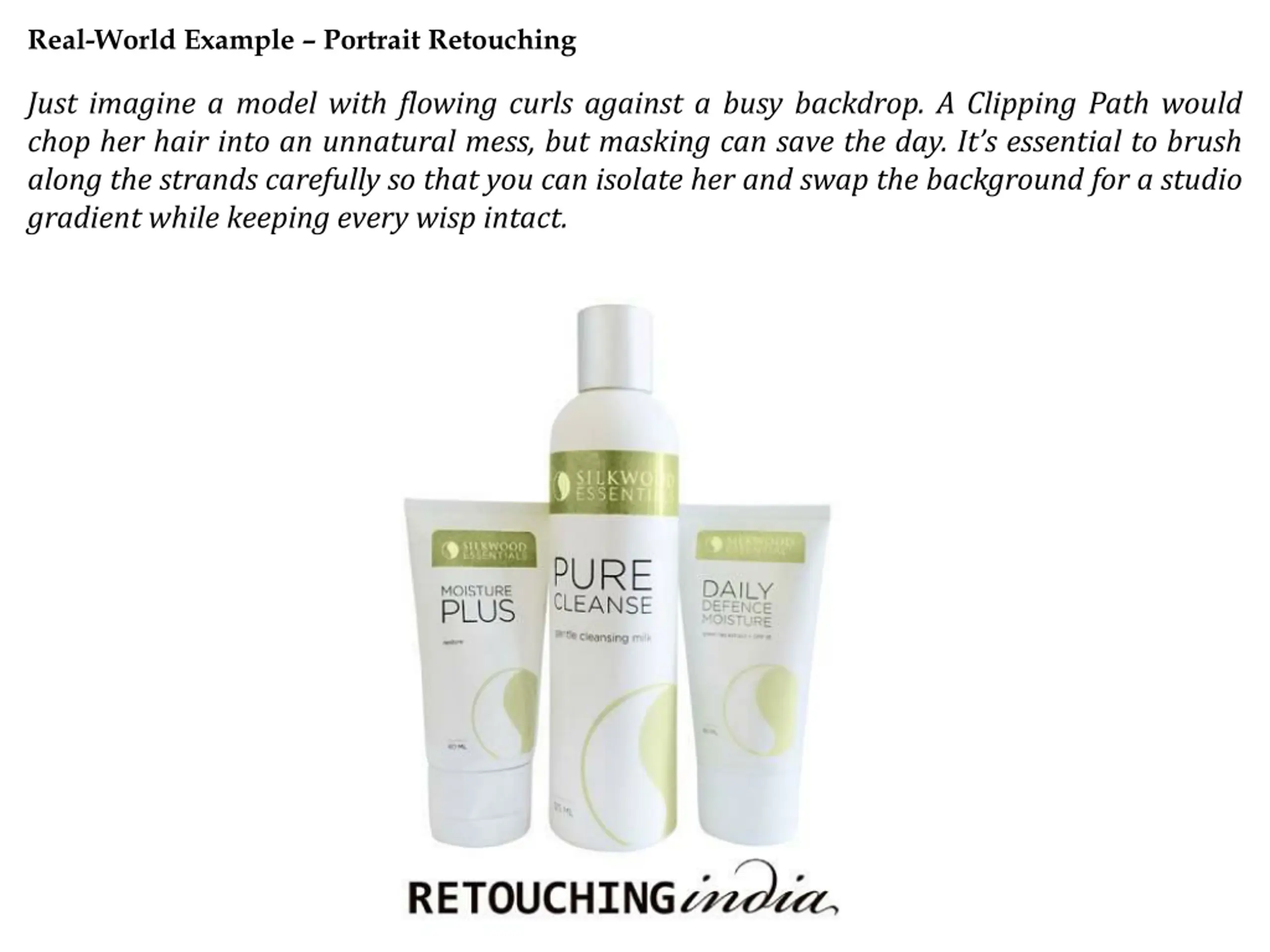 Real-World Example Portrait Retouching Just imagine a model with flowing curls against a busy backdrop. A Clipping Path would chop her hair into an unnatural mess, but masking can save the day. It s essential to brush along the strands carefully so that you can isolate her and swap the background for a studio gradient while keeping every wisp intact.