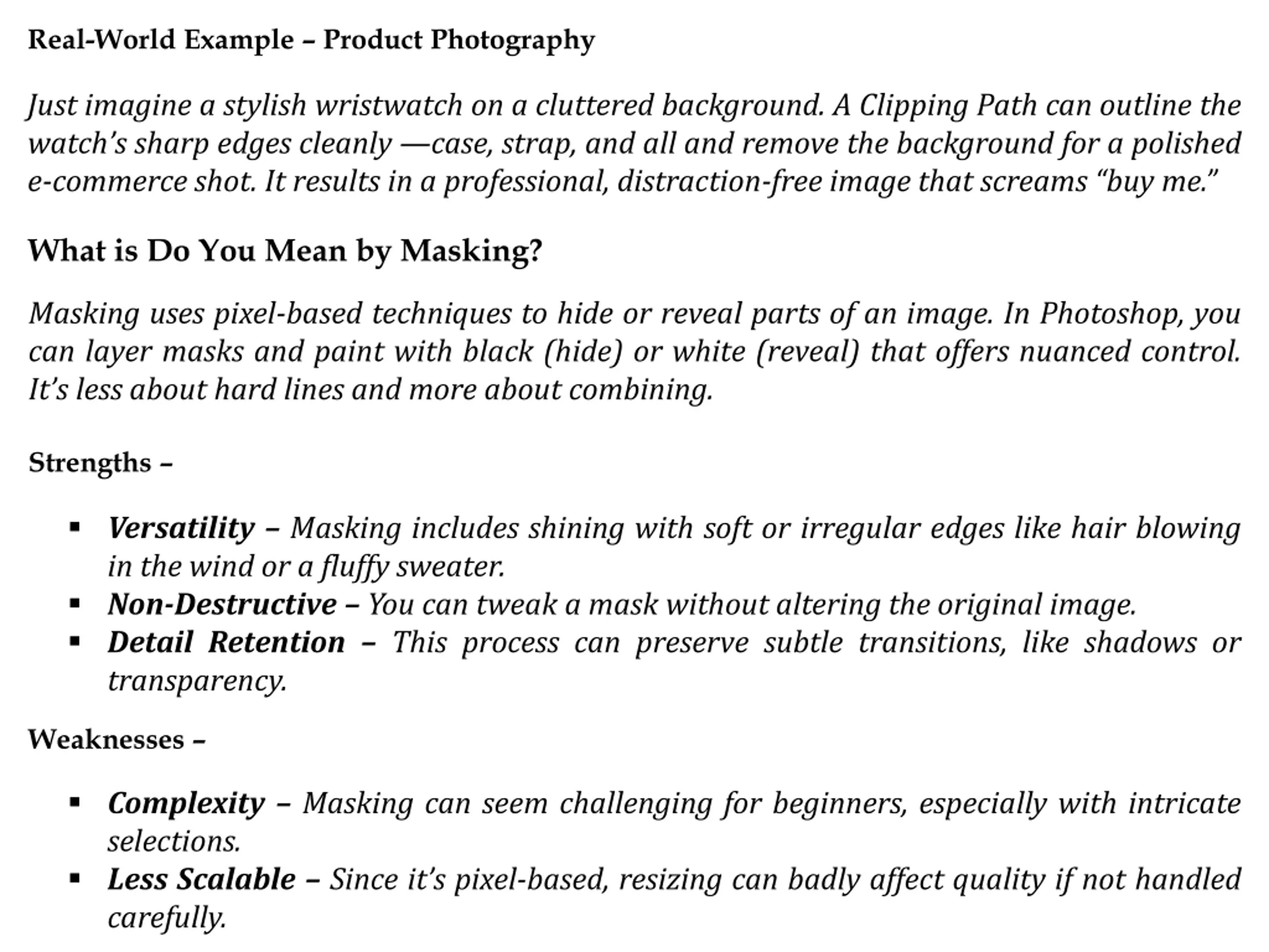 When it comes to photo editing, two techniques work for isolating subjects i.e. Clipping Path & Masking Cutouts. Both are essential tools in a designer s arsenal, but understanding when to use each can affect your project. Please check out this post, to know their strengths, weaknesses, and real-world applications like Product Photography and Portrait Retouching: What is a Clipping Path? A Clipping Path includes using a vector-based tool, like Photoshop s Pen Tool, to draw an outline surrounding an object accurately. Once the path is closed, everything outside it is eliminated that can leave a clean, isolated subject. It s a solution for go-to for hard-edged objects; which deliver sharp results. Strengths Precision Clipping Paths define the straight lines and smooth curves, which make them ideal for objects with clear boundaries. Simplicity The process is simple trace, cut, done. File Flexibility: Since it s based on vectors, the edges remain crisp even when scaled. Weaknesses Time-Intensive Complex shapes with intricate details can take hours to trace precisely. Struggles with Soft Edges You can think of hair, fur, or anything fuzzy as Clipping Paths can t handle these naturally without looking artificial.