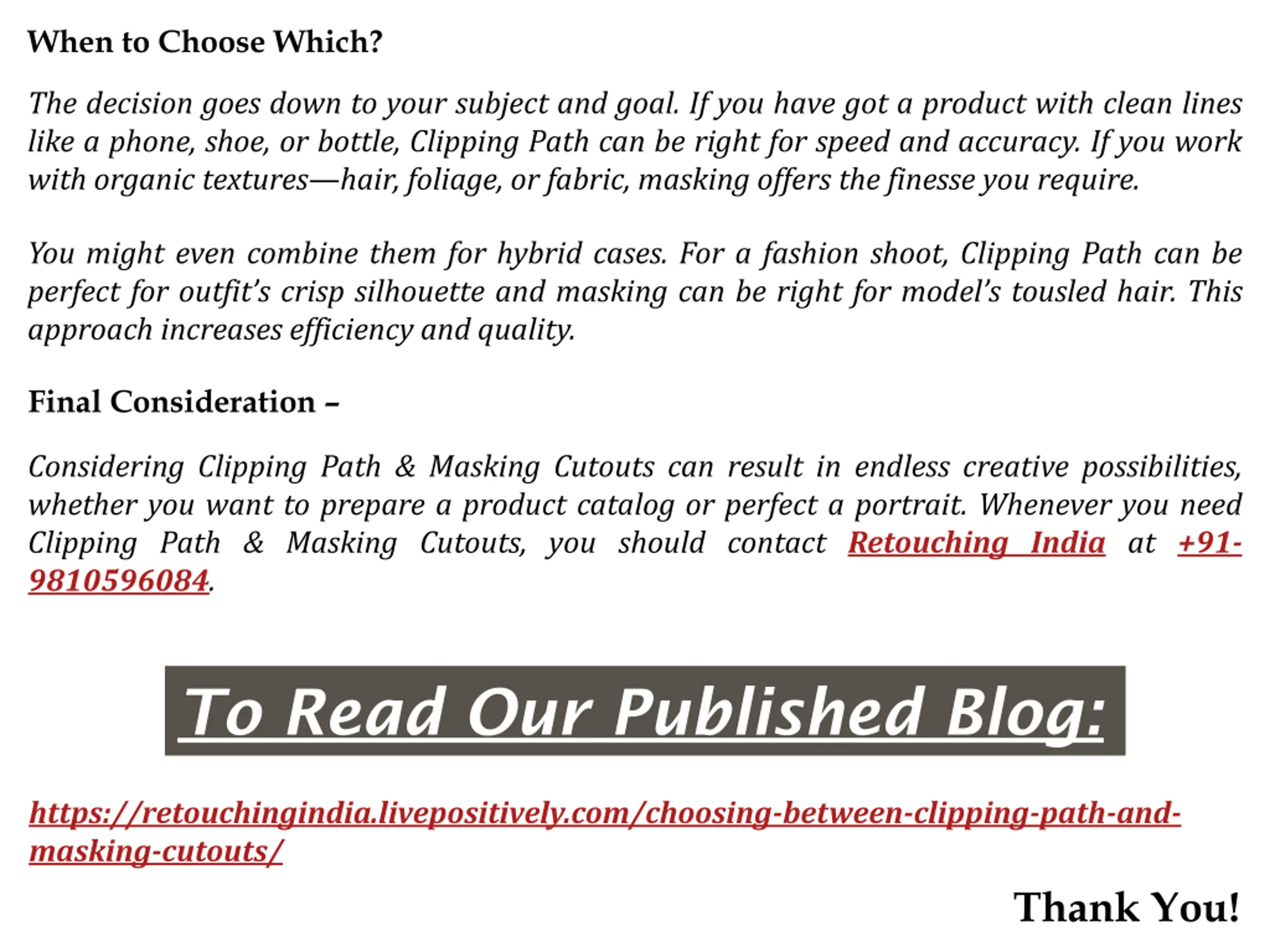 When to Choose Which? The decision goes down to your subject and goal. If you have got a product with clean lines like a phone, shoe, or bottle, Clipping Path can be right for speed and accuracy. If you work with organic textures hair, foliage, or fabric, masking offers the finesse you require. You might even combine them for hybrid cases. For a fashion shoot, Clipping Path can be perfect for outfit s crisp silhouette and masking can be right for model s tousled hair. This approach increases efficiency and quality. Final Consideration Considering Clipping Path & Masking Cutouts can result in endless creative possibilities, whether you want to prepare a product catalog or perfect a portrait. Whenever you need Clipping Path & Masking Cutouts, you should contact Retouching India at +91- 9810596084. To Read Our Published Blog: https://retouchingindia.livepositively.com/choosing-between-clipping-path-and- masking-cutouts/ Thank You!