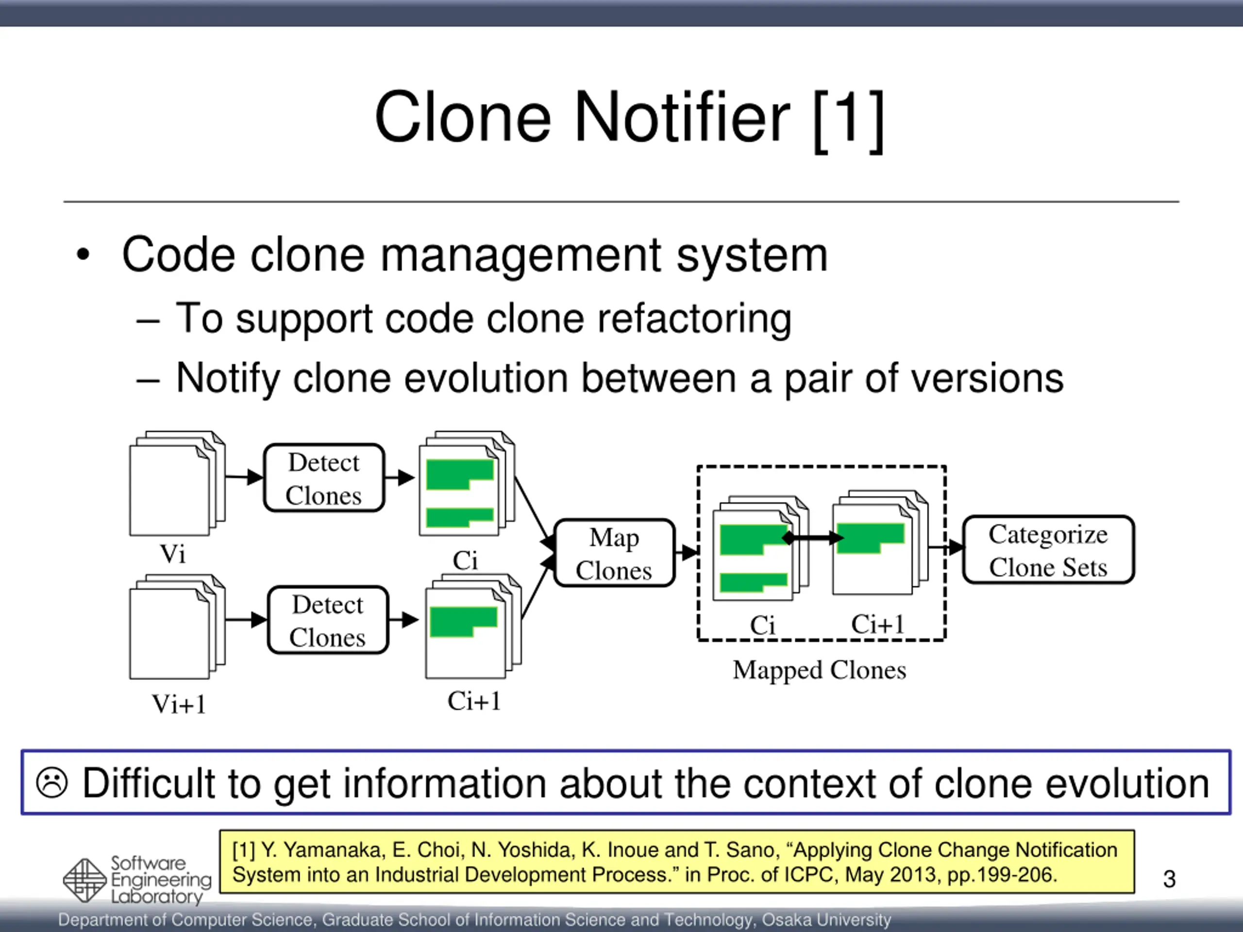 Maintenance of Code Clones [1] Consistent modification Clone set A Clone set A modify Code clones modify Vi Vi+1 Refactoring (i.e. Merging code clones) Clone set B merge call Code clones Vi Vi+1 [1] Y. Yamanaka, E. Choi, N. Yoshida, K. Inoue and T. Sano, Applying Clone Change Notification System into an Industrial Development Process. in Proc. of ICPC, May 2013, pp.199-206. 2 Department of Computer Science, Graduate School of Information Science and Technology, Osaka University