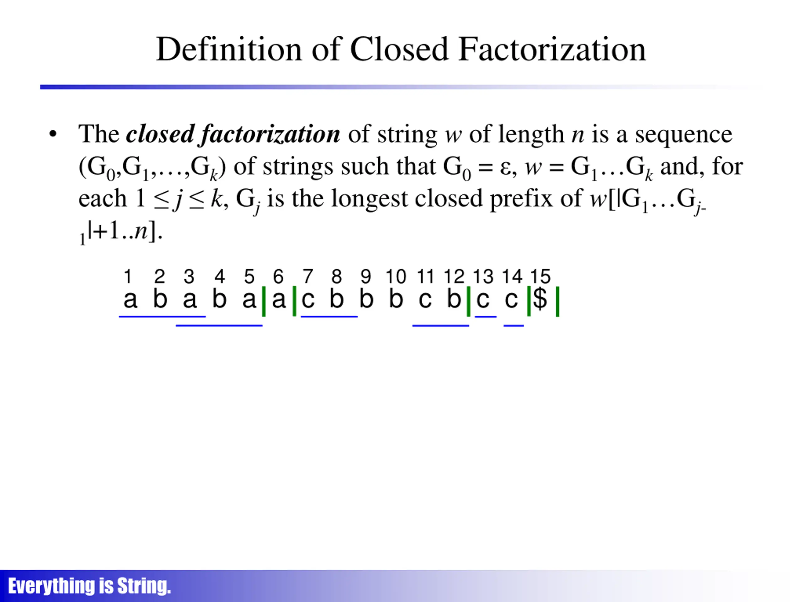 Algorithm of Closed Factorization We can compute each factor Gjin O(|Gj|) time with the KMP algorithm. Because the sum of the lengths of all factors is n, the total time to compute the closed factorization is O(n). Everything is String.