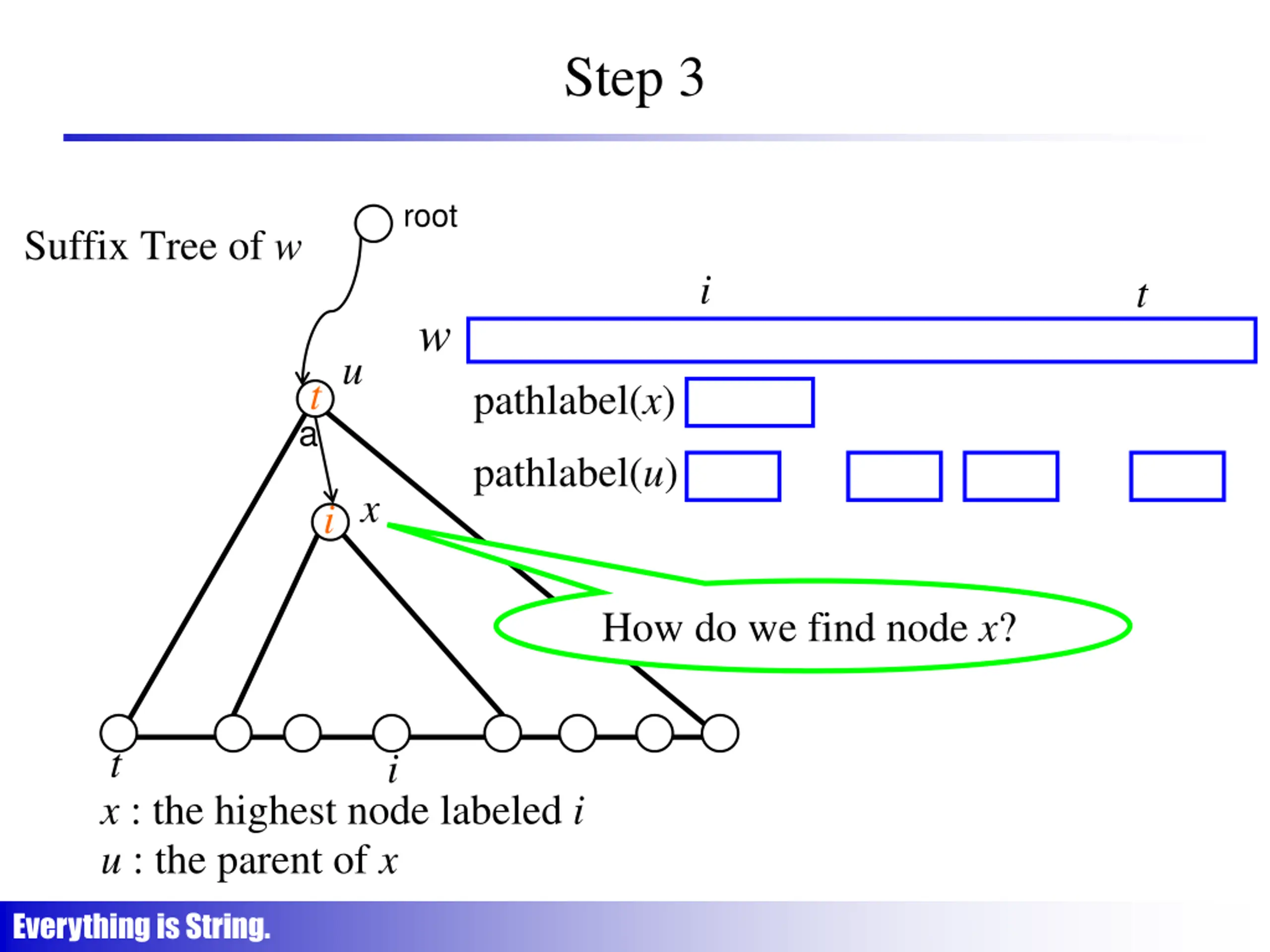Step 3 root Suffix Tree of w i t w u t pathlabel(x) a pathlabel(u) x i How do we find node x? t i x : the highest node labeled i u : the parent of x Everything is String.