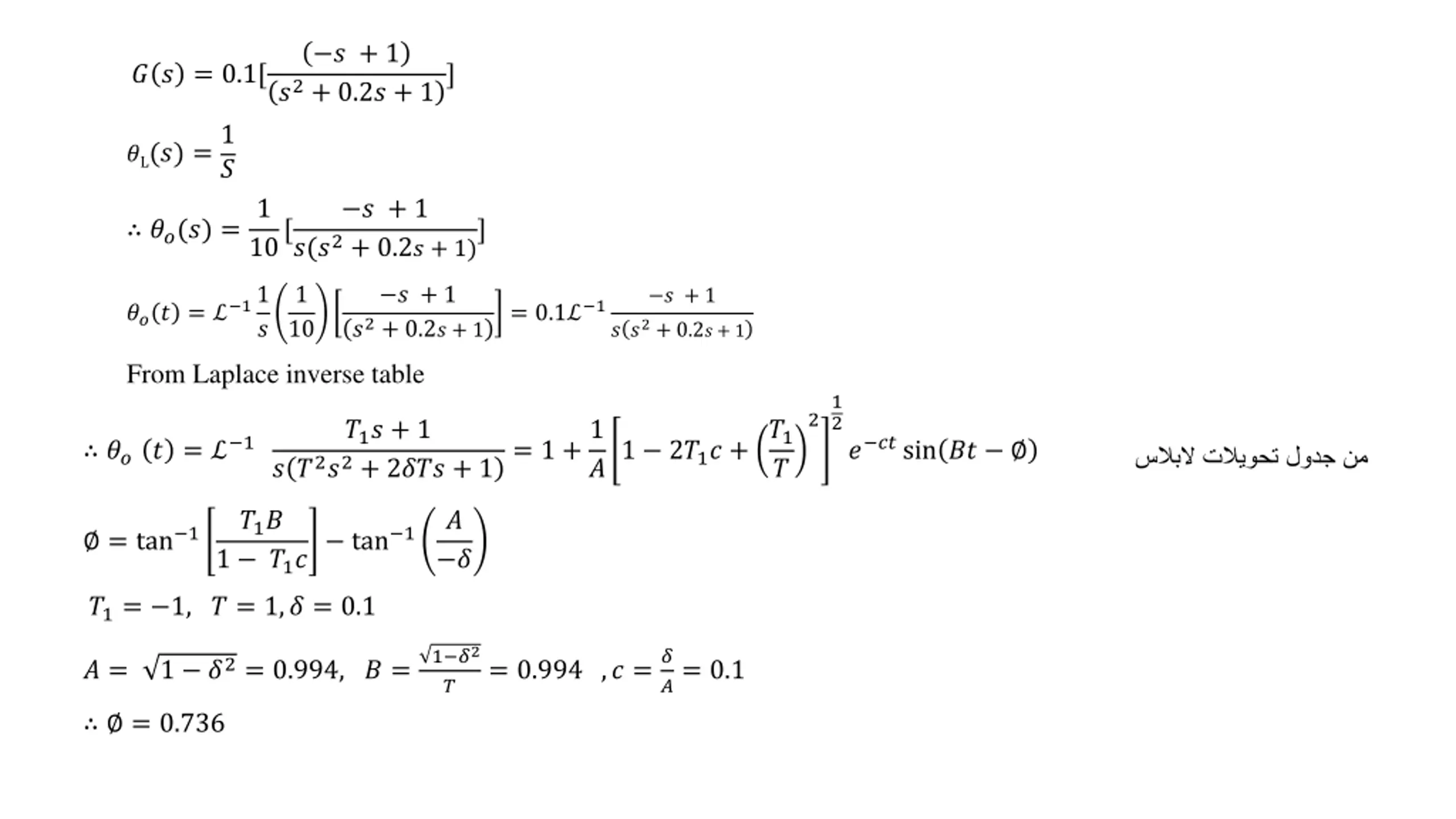 ? + 1 ?2+ 0.2? + 1] ? ? = 0.1[ ?L? =1 ? 1 ? + 1 ??(?) = 10[ ?(?2+ 0.2? + 1)] ??? = 11 1 ? + 1 ?2+ 0.2? + 1 ? + 1 = 0.1 1 ? ?2+ 0.2? + 1 ? 10 From Laplace inverse table 1 2 2 ?1? + 1 = 1 +1 ?1 ? ?? ? = 1 ? ??sin ?? ?1 2?1? + ? ?2?2+ 2??? + 1 ?1? ? = tan 1 tan 1 1 ?1? ? ?1= 1, ? = 1,? = 0.1 1 ?2 ? = 0.994 ,? =? 1 ?2= 0.994, ? = ? = ?= 0.1 = 0.736