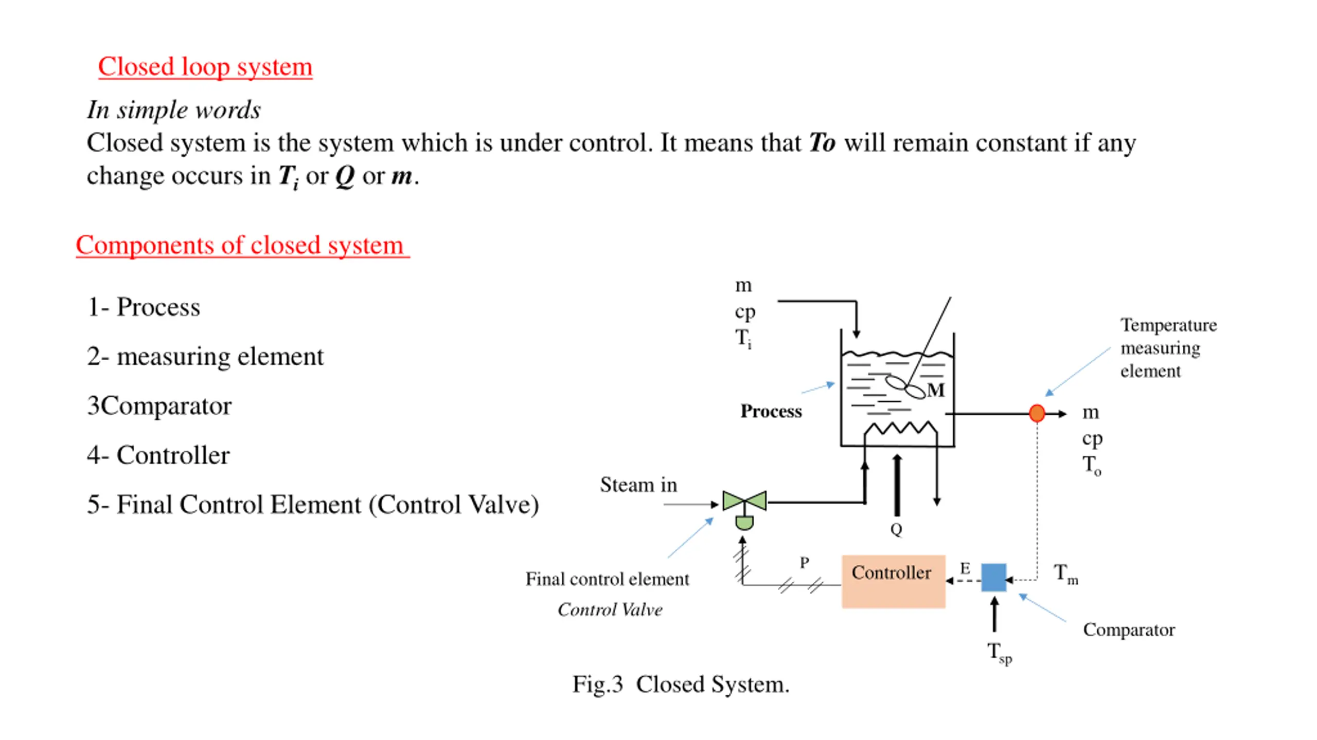 Closed loop system In simple words Closed system is the system which is under control. It means that To will remain constant if any change occurs in Ti or Q or m. Components of closed system m cp Ti 1- Process Temperature measuring element 2- measuring element M 3Comparator m cp To Process 4- Controller Steam in 5- Final Control Element (Control Valve) Q P E Tm Controller Final control element Control Valve Comparator Tsp Fig.3 Closed System.