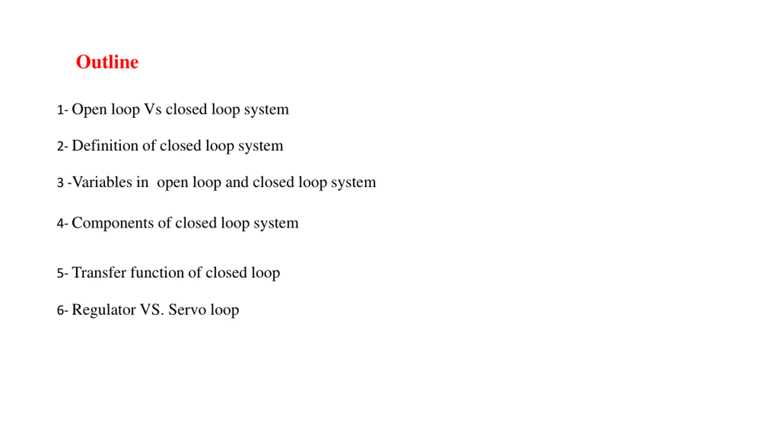 Outline 1- Open loop Vs closed loop system 2- Definition of closed loop system 3 -Variables in open loop and closed loop system 4- Components of closed loop system 5- Transfer function of closed loop 6- Regulator VS. Servo loop