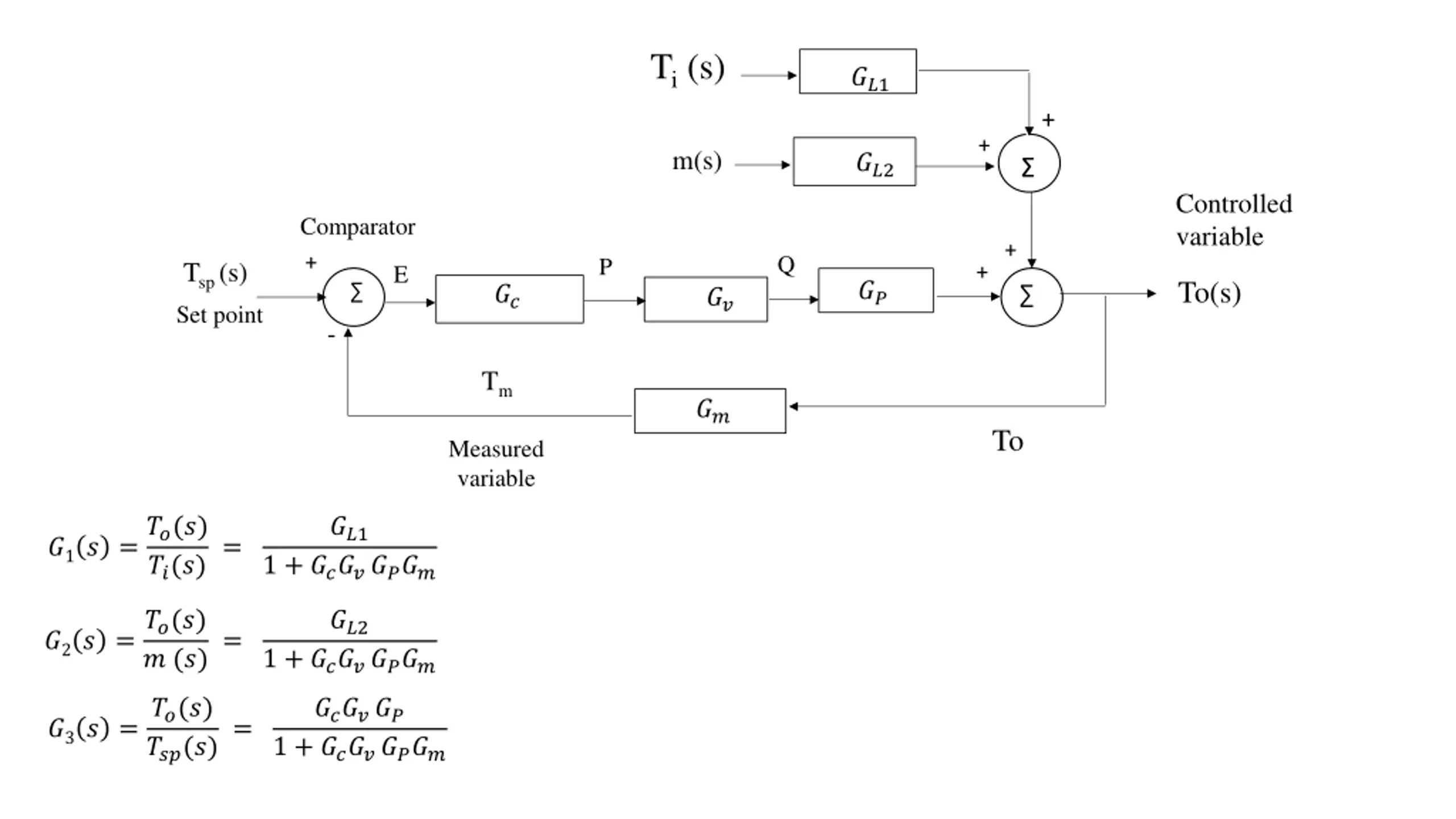 Ti (s) ??1 + + m(s) ??2 Controlled variable Comparator + Q + P Tsp (s) Set point E + To(s) ?? ?? ?? - Tm ?? To Measured variable ?1? =??(?) ??1 ??(?) = 1 + ???? ???? ?2? =??(?) ??2 ? (?) = 1 + ???? ???? ?3? =??(?) ???? ?? 1 + ???? ???? ???(?) =