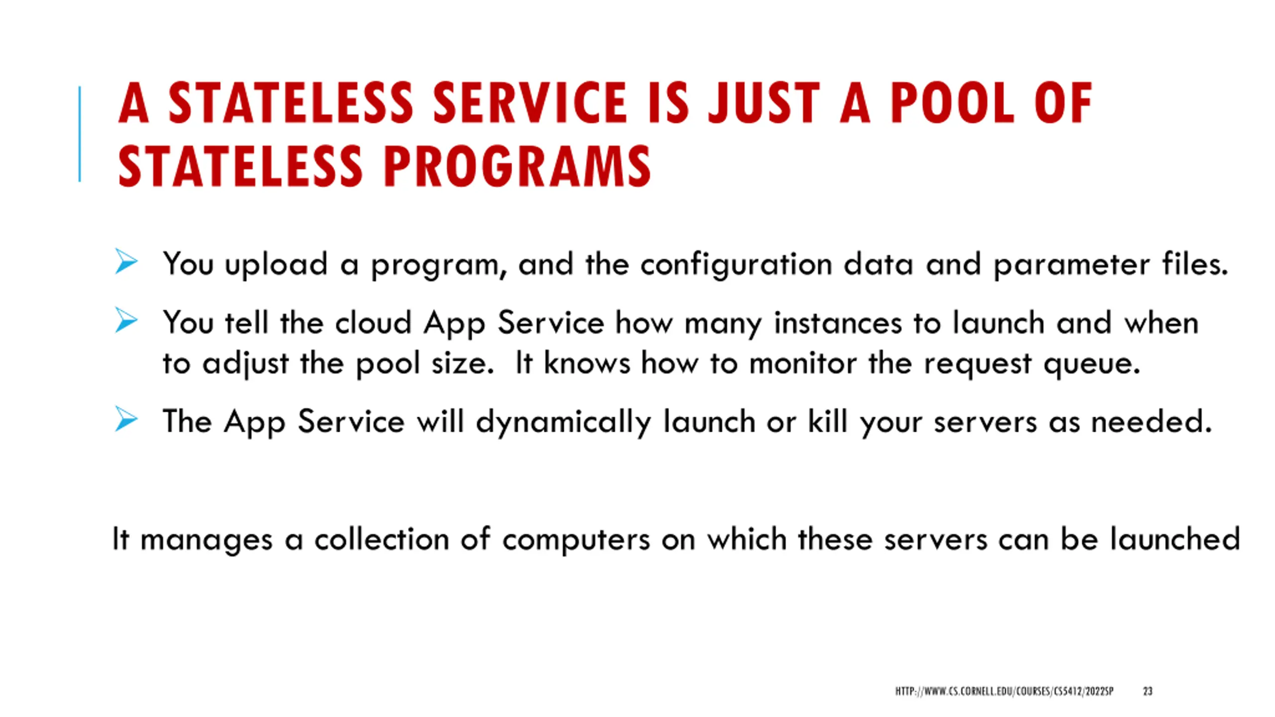 A STATELESS SERVICE IS JUST A POOL OF STATELESS PROGRAMS You upload a program, and the configuration data and parameter files. You tell the cloud App Service how many instances to launch and when to adjust the pool size. It knows how to monitor the request queue. The App Service will dynamically launch or kill your servers as needed. It manages a collection of computers on which these servers can be launched HTTP://WWW.CS.CORNELL.EDU/COURSES/CS5412/2022SP 23