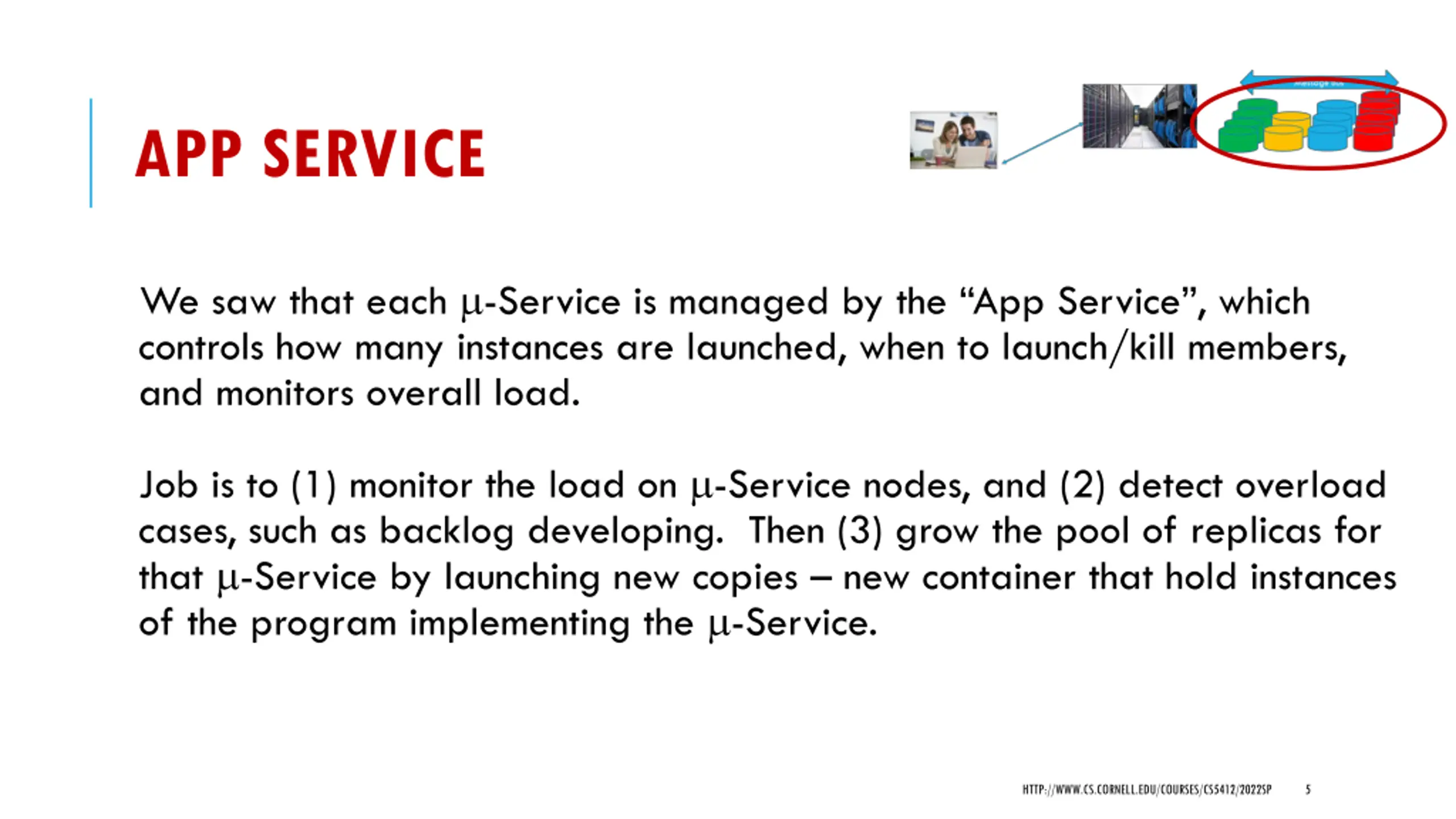 APP SERVICE We saw that each -Service is managed by the App Service , which controls how many instances are launched, when to launch/kill members, and monitors overall load. Job is to (1) monitor the load on -Service nodes, and (2) detect overload cases, such as backlog developing. Then (3) grow the pool of replicas for that -Service by launching new copies new container that hold instances of the program implementing the -Service. HTTP://WWW.CS.CORNELL.EDU/COURSES/CS5412/2022SP 5