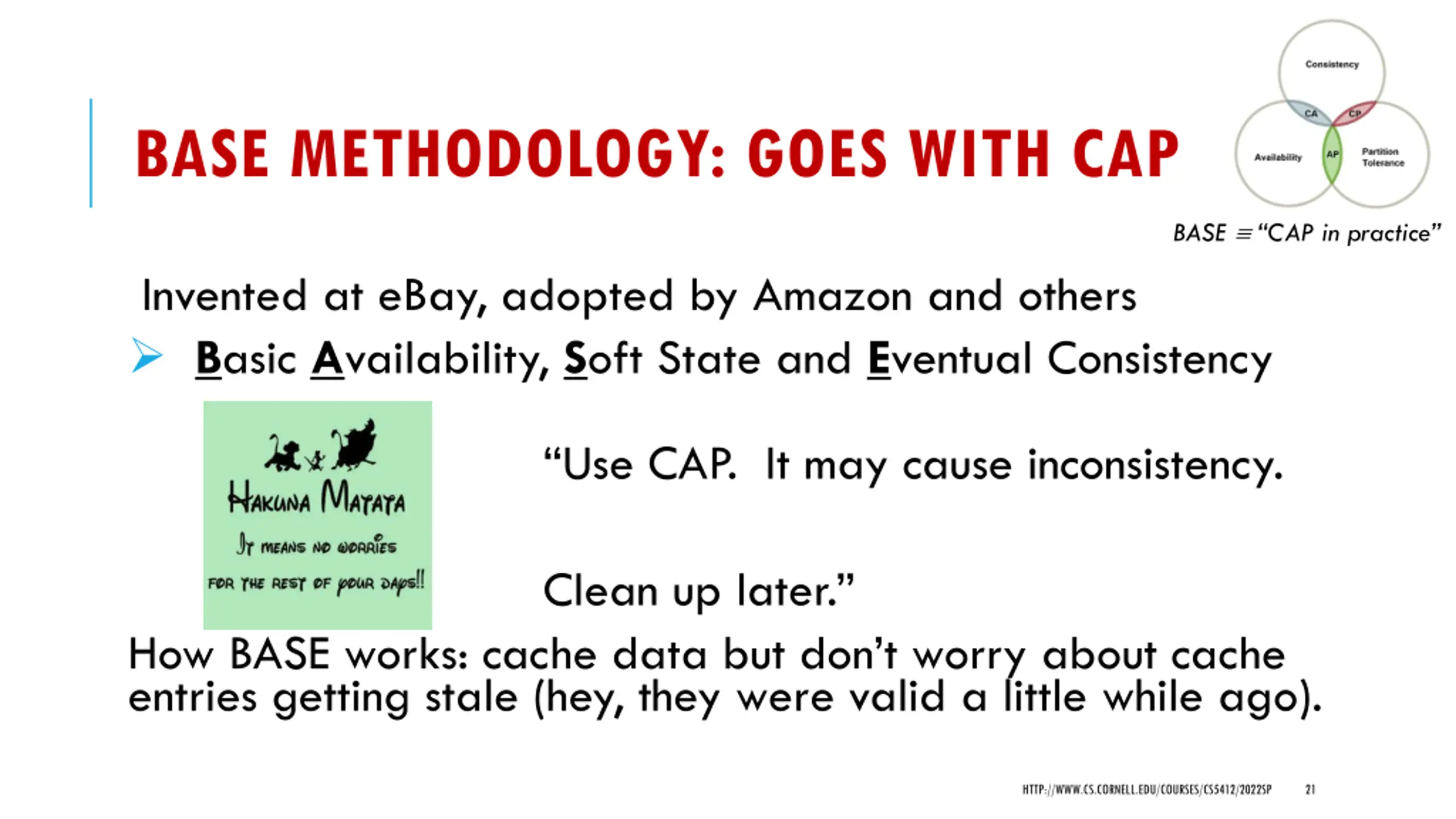 BASE METHODOLOGY: GOES WITH CAP BASE CAP in practice Invented at eBay, adopted by Amazon and others Basic Availability, Soft State and Eventual Consistency Use CAP. It may cause inconsistency. Clean up later. How BASE works: cache data but don t worry about cache entries getting stale (hey, they were valid a little while ago). HTTP://WWW.CS.CORNELL.EDU/COURSES/CS5412/2022SP 21