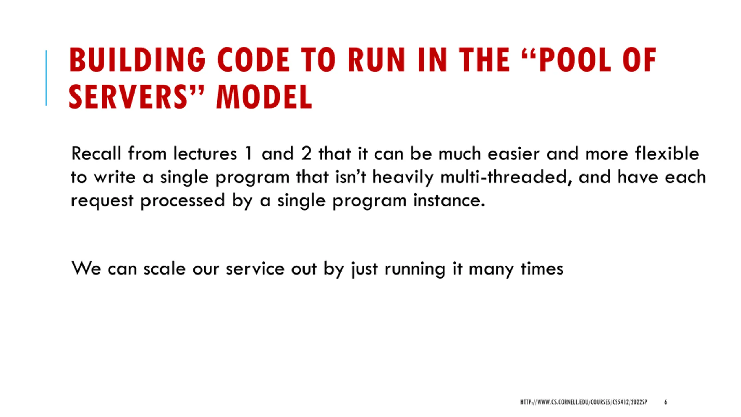 BUILDING CODE TO RUN IN THE POOL OF SERVERS MODEL Recall from lectures 1 and 2 that it can be much easier and more flexible to write a single program that isn t heavily multi-threaded, and have each request processed by a single program instance. We can scale our service out by just running it many times HTTP://WWW.CS.CORNELL.EDU/COURSES/CS5412/2022SP 6