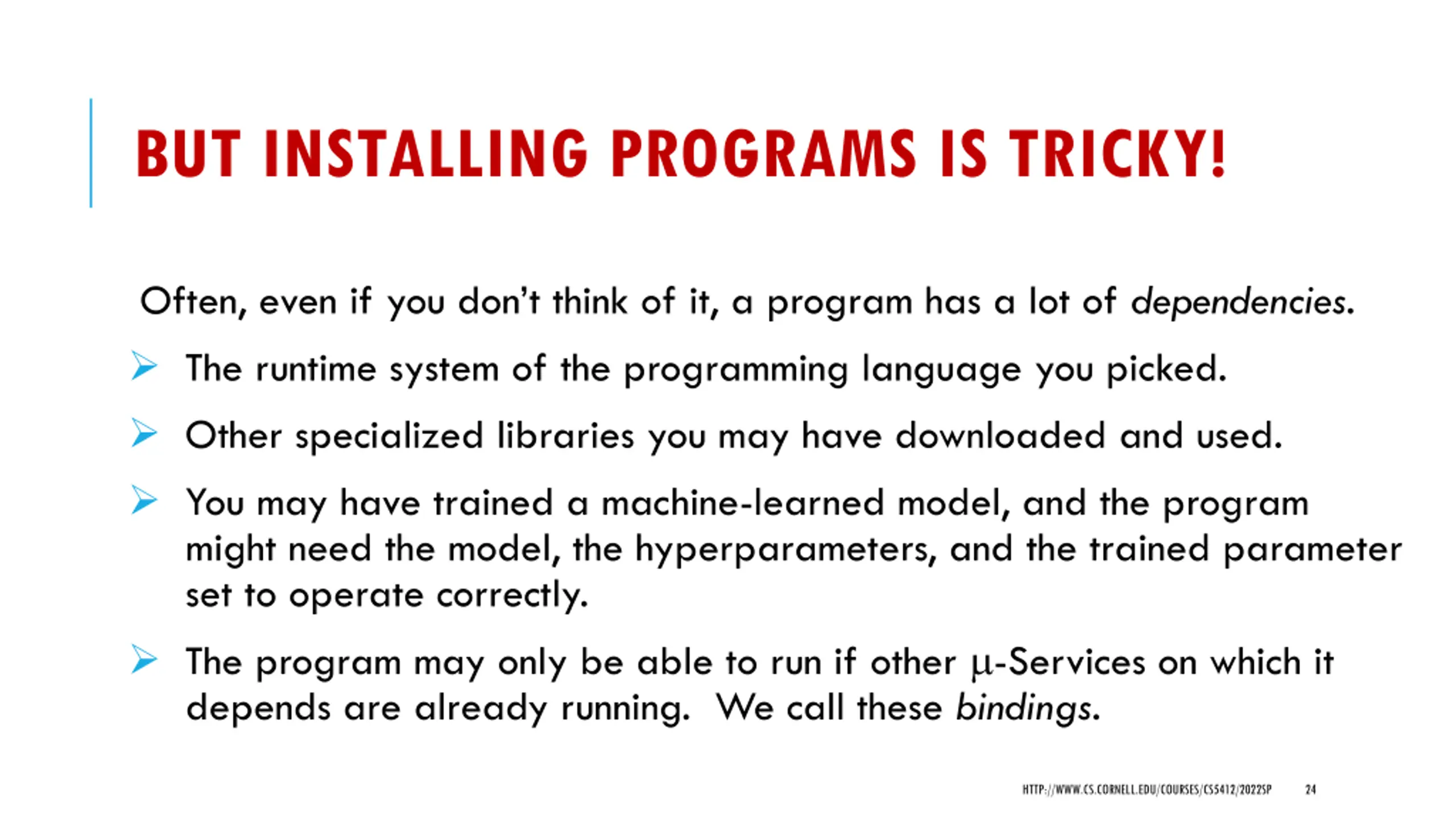 BUT INSTALLING PROGRAMS IS TRICKY! Often, even if you don t think of it, a program has a lot of dependencies. The runtime system of the programming language you picked. Other specialized libraries you may have downloaded and used. You may have trained a machine-learned model, and the program might need the model, the hyperparameters, and the trained parameter set to operate correctly. The program may only be able to run if other -Services on which it depends are already running. We call these bindings. HTTP://WWW.CS.CORNELL.EDU/COURSES/CS5412/2022SP 24