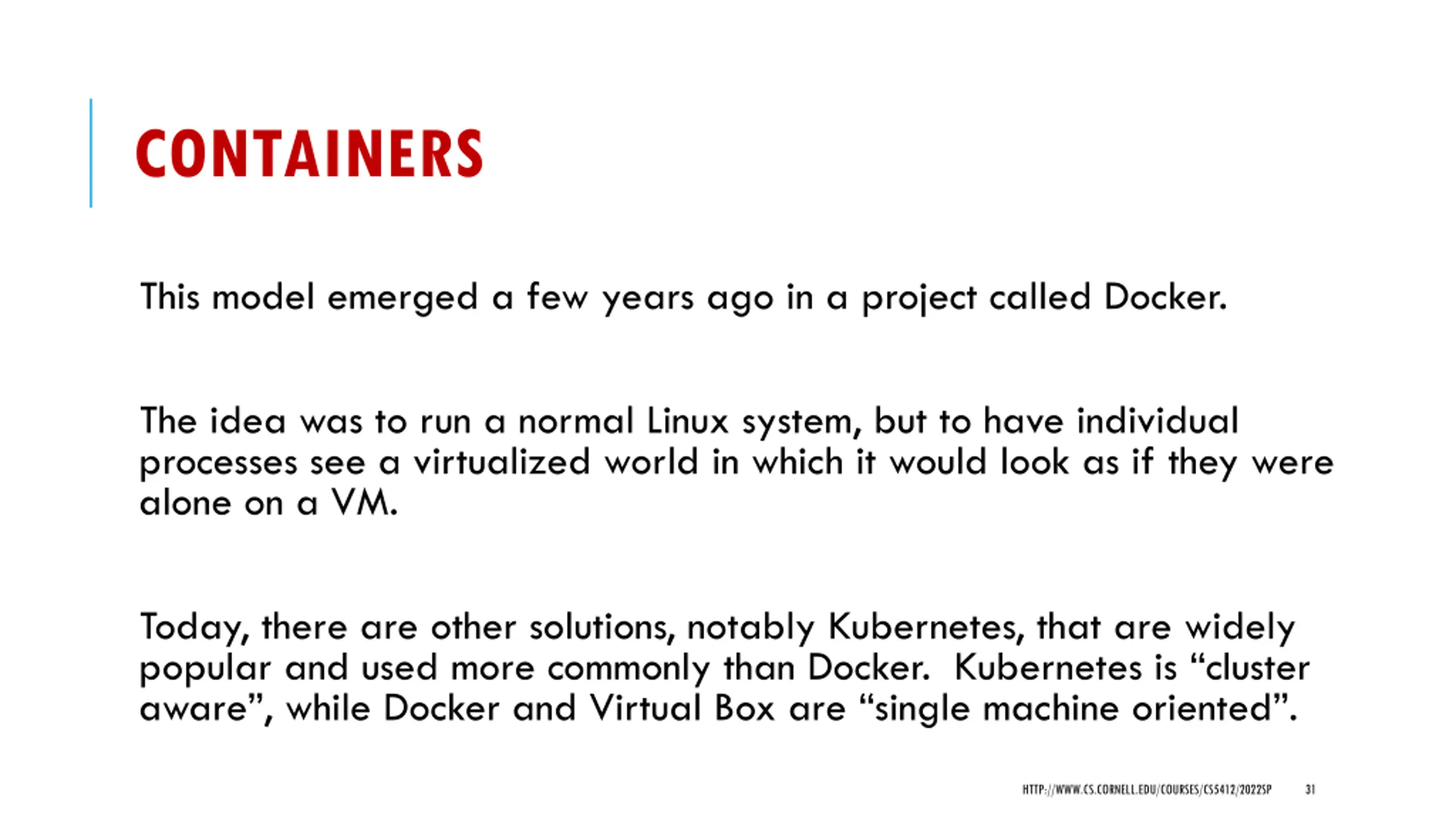 CONTAINERS This model emerged a few years ago in a project called Docker. The idea was to run a normal Linux system, but to have individual processes see a virtualized world in which it would look as if they were alone on a VM. Today, there are other solutions, notably Kubernetes, that are widely popular and used more commonly than Docker. Kubernetes is cluster aware , while Docker and Virtual Box are single machine oriented . HTTP://WWW.CS.CORNELL.EDU/COURSES/CS5412/2022SP 31