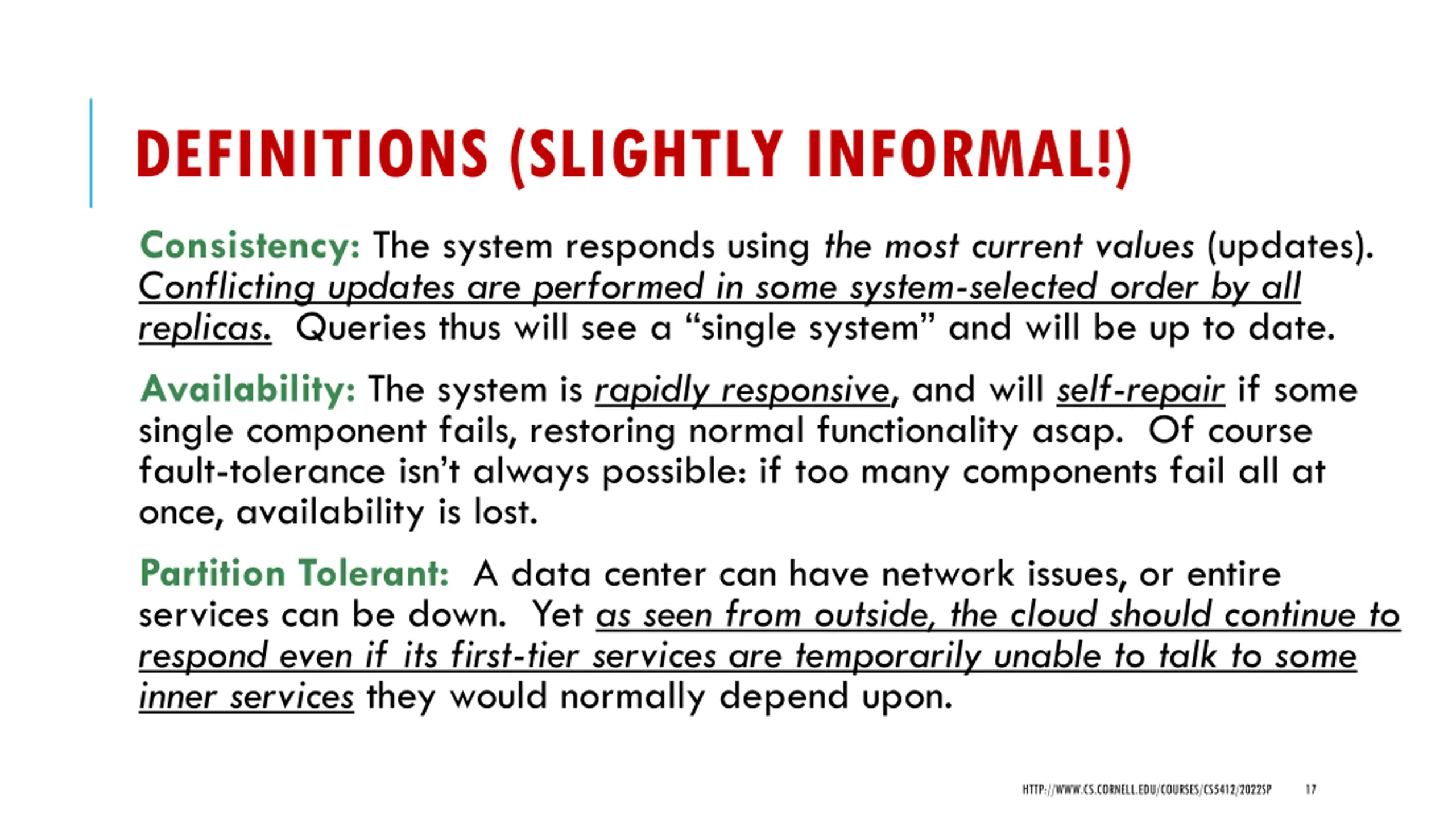 DEFINITIONS (SLIGHTLY INFORMAL!) Consistency: The system responds using the most current values (updates). Conflicting updates are performed in some system-selected order by all replicas. Queries thus will see a single system and will be up to date. Availability: The system is rapidly responsive, and will self-repair if some single component fails, restoring normal functionality asap. Of course fault-tolerance isn t always possible: if too many components fail all at once, availability is lost. Partition Tolerant: A data center can have network issues, or entire services can be down. Yet as seen from outside, the cloud should continue to respond even if its first-tier services are temporarily unable to talk to some inner services they would normally depend upon. HTTP://WWW.CS.CORNELL.EDU/COURSES/CS5412/2022SP 17