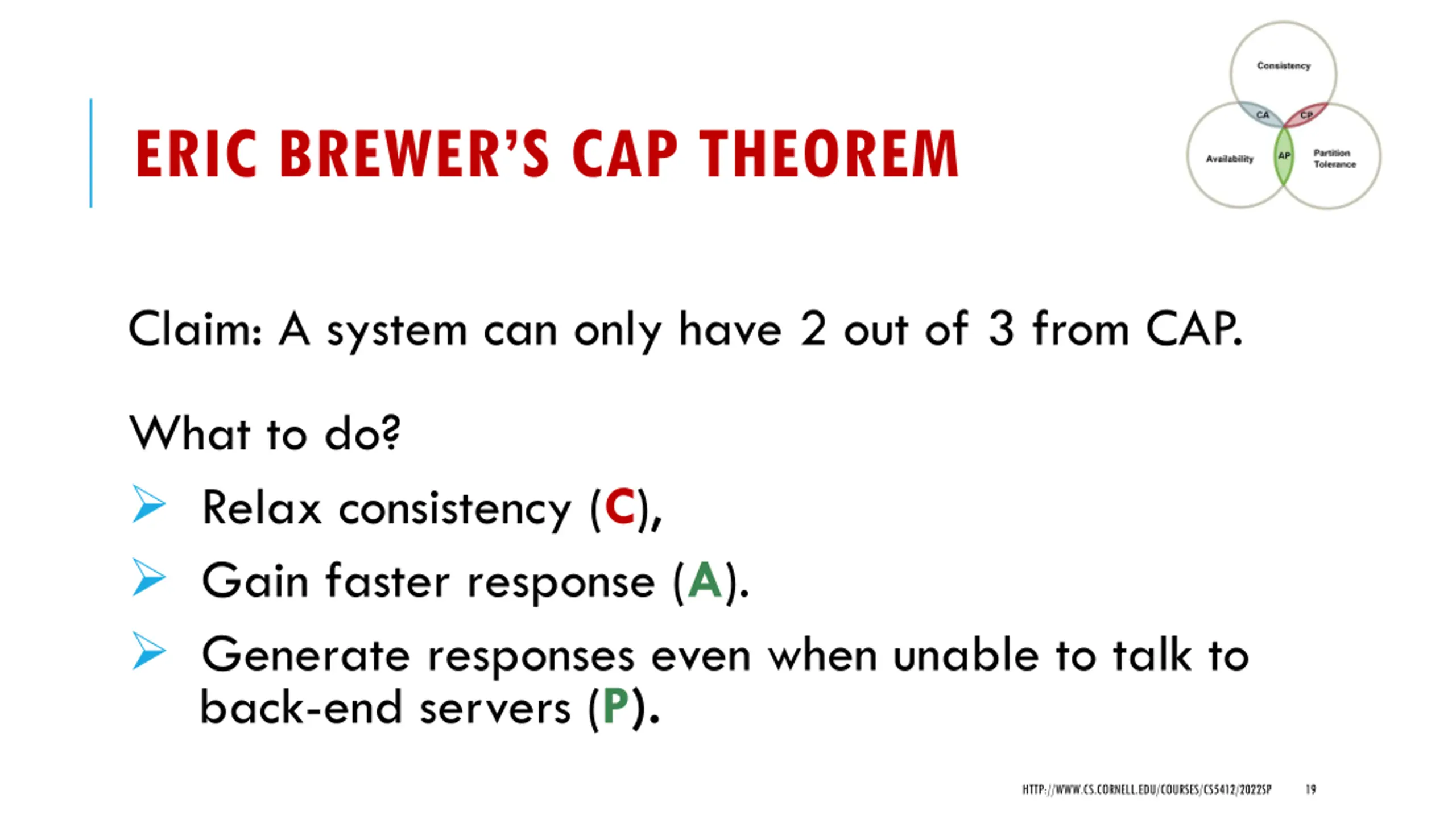 ERIC BREWERS CAP THEOREM Claim: A system can only have 2 out of 3 from CAP. What to do? Relax consistency (C), Gain faster response (A). Generate responses even when unable to talk to back-end servers (P). HTTP://WWW.CS.CORNELL.EDU/COURSES/CS5412/2022SP 19
